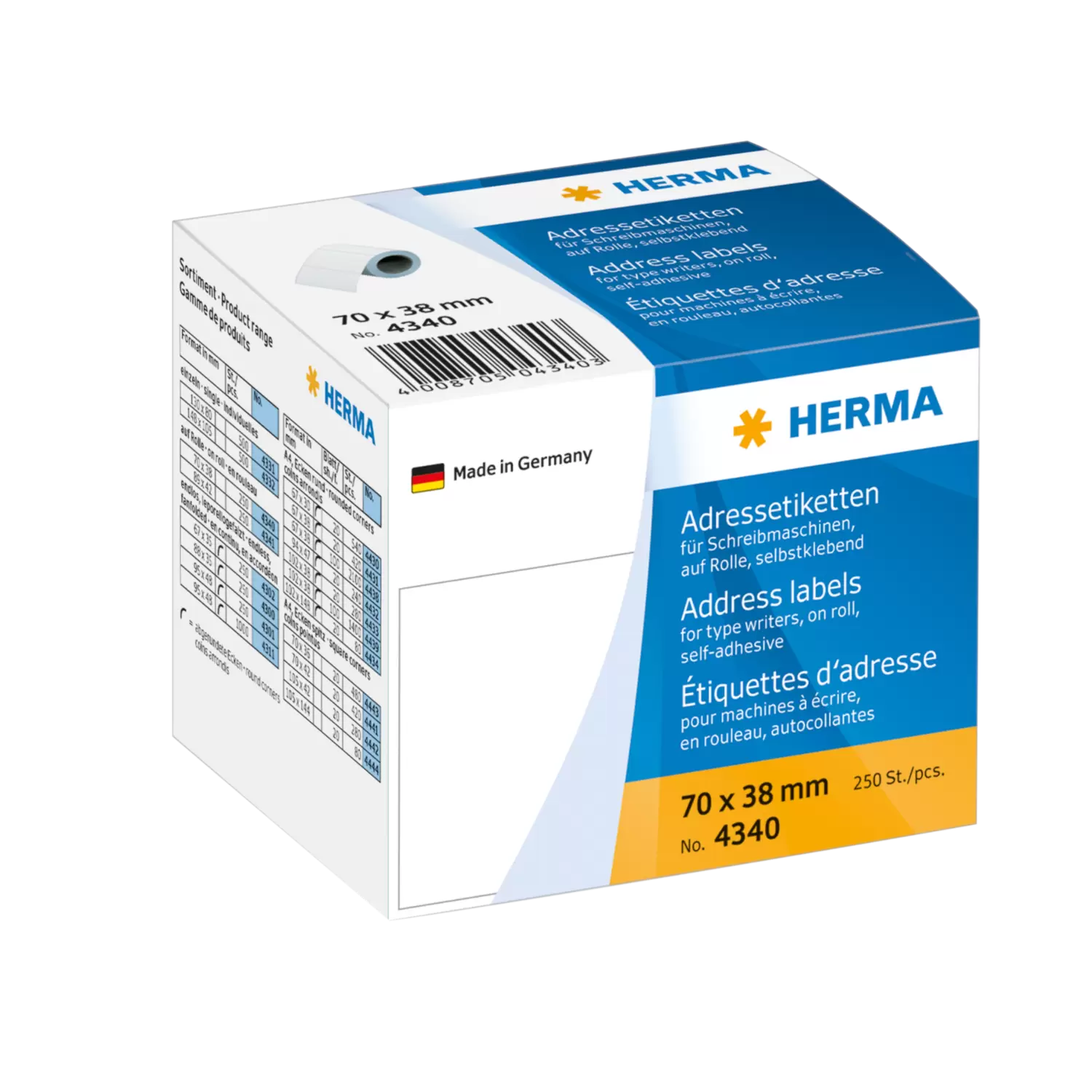 Adressetiketten voor schrijfmachines op rollen, zelfklevend. Voor adresseren, kenmerken van akten, regalen, voorraadbakken, voor overkleven of als tekstetiket voor monsters, foto's, etc. Hoogwaardig, houtvrij wit schrijfpapier, dekkende kwaliteit. Chloorvrij gebleekt, oplosmiddelvrije contactlijm. Voor schrijfmachine of handbeschrijving. Niet geschikt voor PC printers.