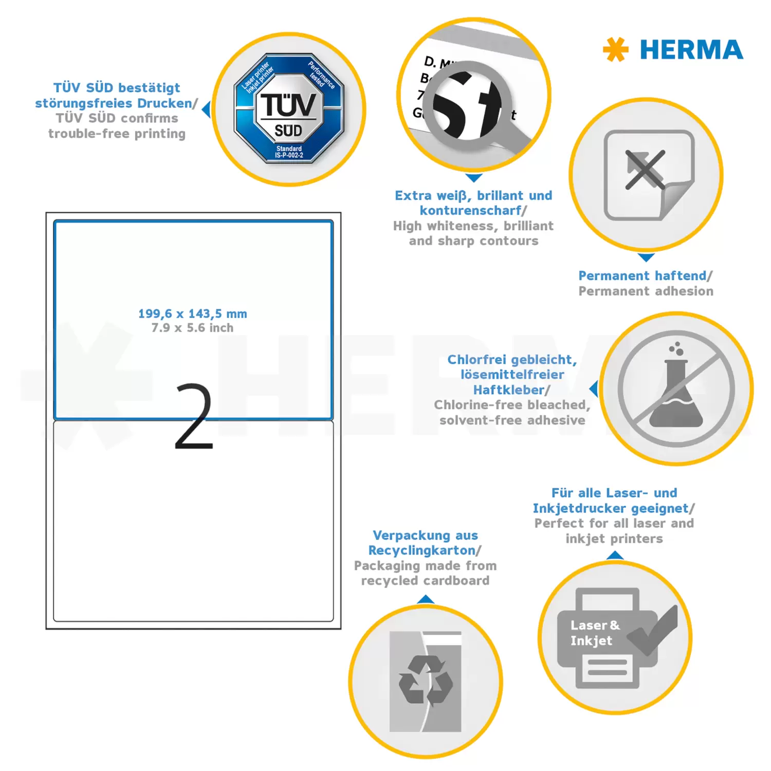 PREMIUM adresetiketten, A4, 199,6 x 143,5 mm, wit, permanent hechtend