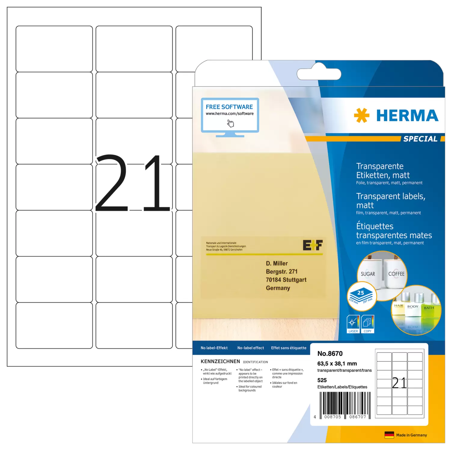 Transparante folie-adresetiketten mat, A4, 63,5 x 38,1 mm, ronde hoeken folie
