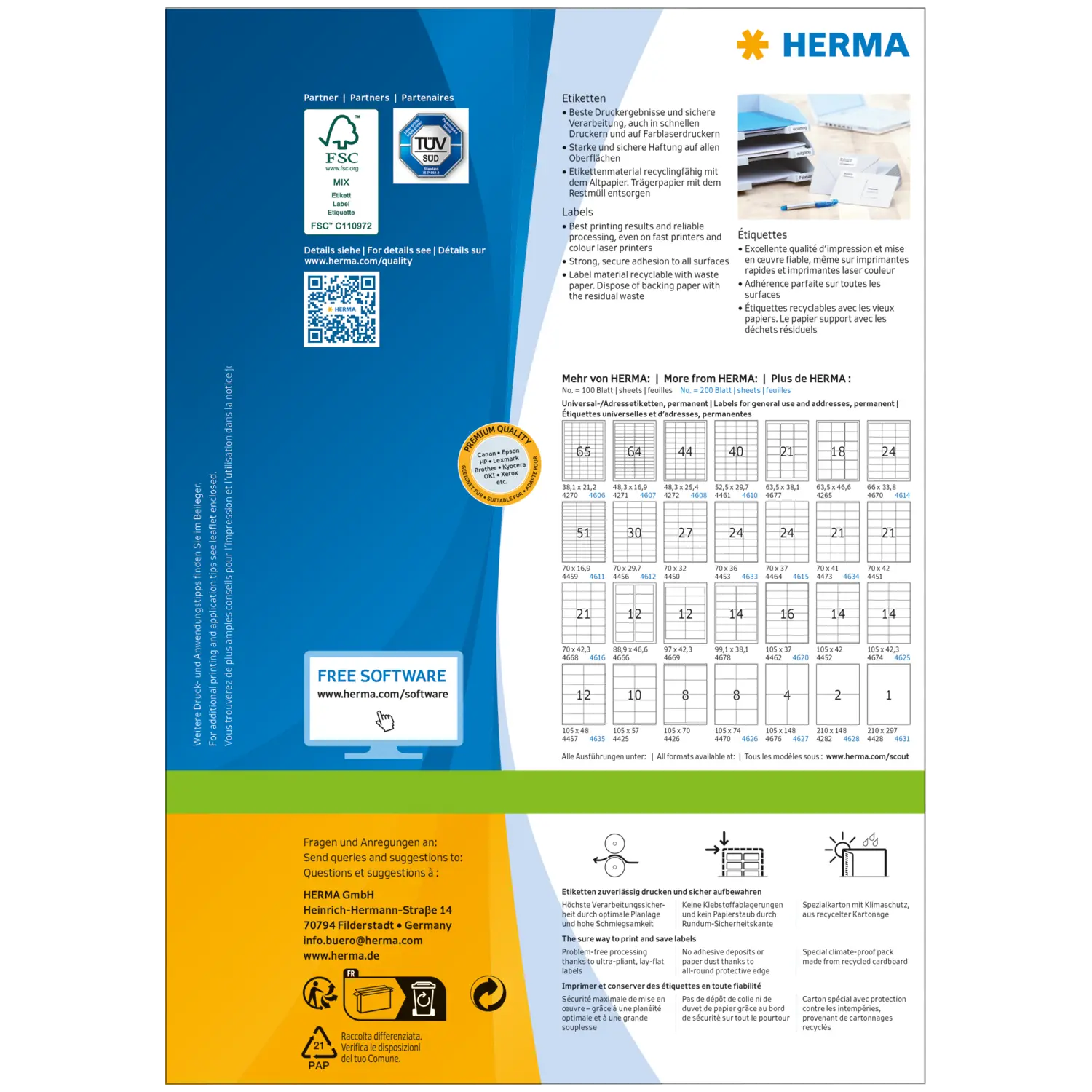 Zelfklevende etiketten op A4-vellen, permanent hechtend. Perfect voor alle laser- en inkjetprinters, kopieerapparaten, kleurenlaserprinters en kleurenkopieerapparaten. Gegarandeerd storingvrije loop en geschikt voor high-speed dankzij extra sterke speciale materiaalsamenstelling, top-vlakligging en een veiligheidsrand rondom. Probleemloze doorvoer door de printer voor laserprinters en inkjetprinters getest en bevestigd door de TÜV SÜD. Hoge witheidsgraad en gelijkmatig oppervlak voor de beste afdrukresultaten in zwart/wit en kleur. Voelbaar dikker: extra dikke etiketten, eenvoudig opplakken. Zeer snel en goed hechtend, ook op koude en vochtige oppervlakken. Milieuvriendelijk en duurzaam: chloorvrij gebleekt, FSC® Mix Credit-gecertificeerd, oplosmiddelvrije contactlijm. Etikettenmateriaal recyclebaar via het oud papier, gooi rugpapier bij het restafval weg, verpakking van gerecycled karton. Gratis softwareoplossingen: www.herma.com/software.