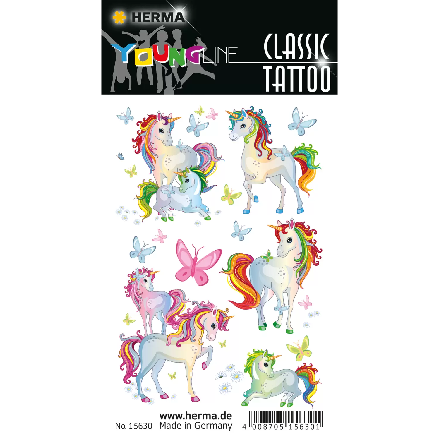 Tattoos hoeven niet voor eeuwig te zijn: met tattoostickers tover je prachtige plaatjes op je huid – maar dan tijdelijk. Huidvriendelijk, gemakkelijk aan te brengen en nog gemakkelijker weer te verwijderen: dat zijn de coole tattoostickers van HERMA. De gewenste tattoo uitknippen, de beschermende folie eraf trekken en op de gewenste plaats op de huid aanbrengen, met een vochtige doek 30 seconden stevig aandrukken en eraf trekken – klaar. De tattoos zijn watervast en blijven enkele dagen goed op de huid. Bovendien kunnen ze er heel gemakkelijk weer worden afgewassen: gewoon een beetje huid- of spijsolie op een doekje doen en de tattoo er zachtjes afvegen, deze wordt zonder resten achter te laten verwijderd. Een groot plezier voor groot en klein! Het populaire ontwerp ‘eenhoorns’ van HERMA is er nu ook als prachtige tattoostickers! De betoverende fabelfiguren zijn bij jongens en meisjes zeer geliefd: dé hit bij de volgende kinderverjaardag of als de vriendjes op bezoek komen.