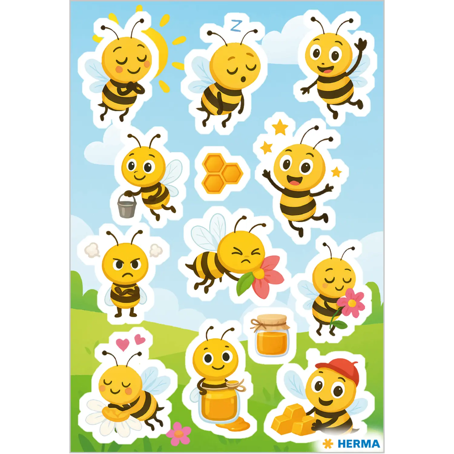 Dit vrolijke stickervel vol ondeugende honingbijen brengt een zoete glimlach in het dagelijks leven van iedereen die dol is op deze kleine nectarverzamelaars. Elke bij is liefdevol geïllustreerd en nodigt dan kzij de schattige blikken uit tot lachen en dromen. Met deze stickerset wordt het dagelijkse leven van de bijen gevolgd: soms zijn de kleine bijen op ontdekkingstocht, soms slapen ze vredig te midden van kleurrijke bloemen. De perfecte stickers voor zonnige zomerdagen! Of het nu op de honingpot, in het vriendenboekje of in het huiswerkboekje is de ijverige bijen zijn ideaal om te verzamelen, te ruilen of te versieren, want waar ze ook zijn, ze blijken een bijzondere blikvanger te zijn. Als kleine verrassing toveren ze snel een glimlach op het gezicht en brengen ze kleurrijke bijenfantasieën in elke kinderkamer!