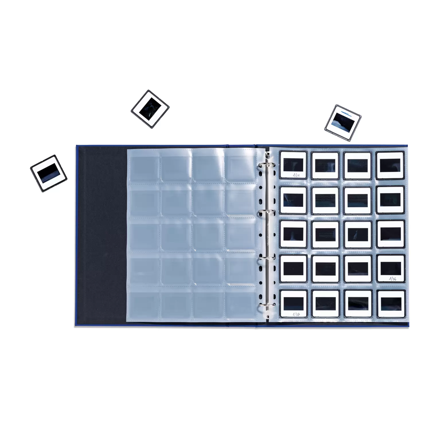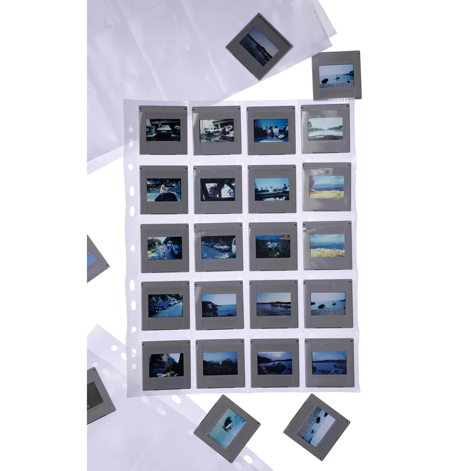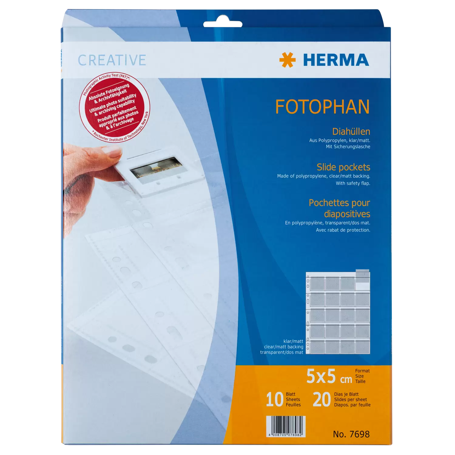De HERMA diahoesjes zijn ideaal voor het netjes en overzichtelijk bewaren en archiveren van kleinbeeld-dia's. Ze zijn gemaakt van transparant, robuust en weekmakervrij heldermat polypropyleen en bieden per hoesje plek aan 20 ingeraamde dia's van het formaat 50 x 50 mm. Bijzonder eraan zijn de speciale beschermflapjes die voorkomen dat de dia's uit de hoesjes kunnen vallen. Zo kunnen de dia's er gemakkelijk worden ingestoken en uitgenomen en zijn desondanks optimaal beschermd. Een hoesje is ca. 24,4 x 30,1 cm groot en kan dankzij de europerforatie gemakkelijk in ordners, ringbanden of fotoboeken worden opgeborgen. Voor het optimaal vasthouden worden varianten met 4 ringen aanbevolen. Er zitten 10 hoesjes in een verpakking en dus is er voldoende plek voor max. 200 dia's.