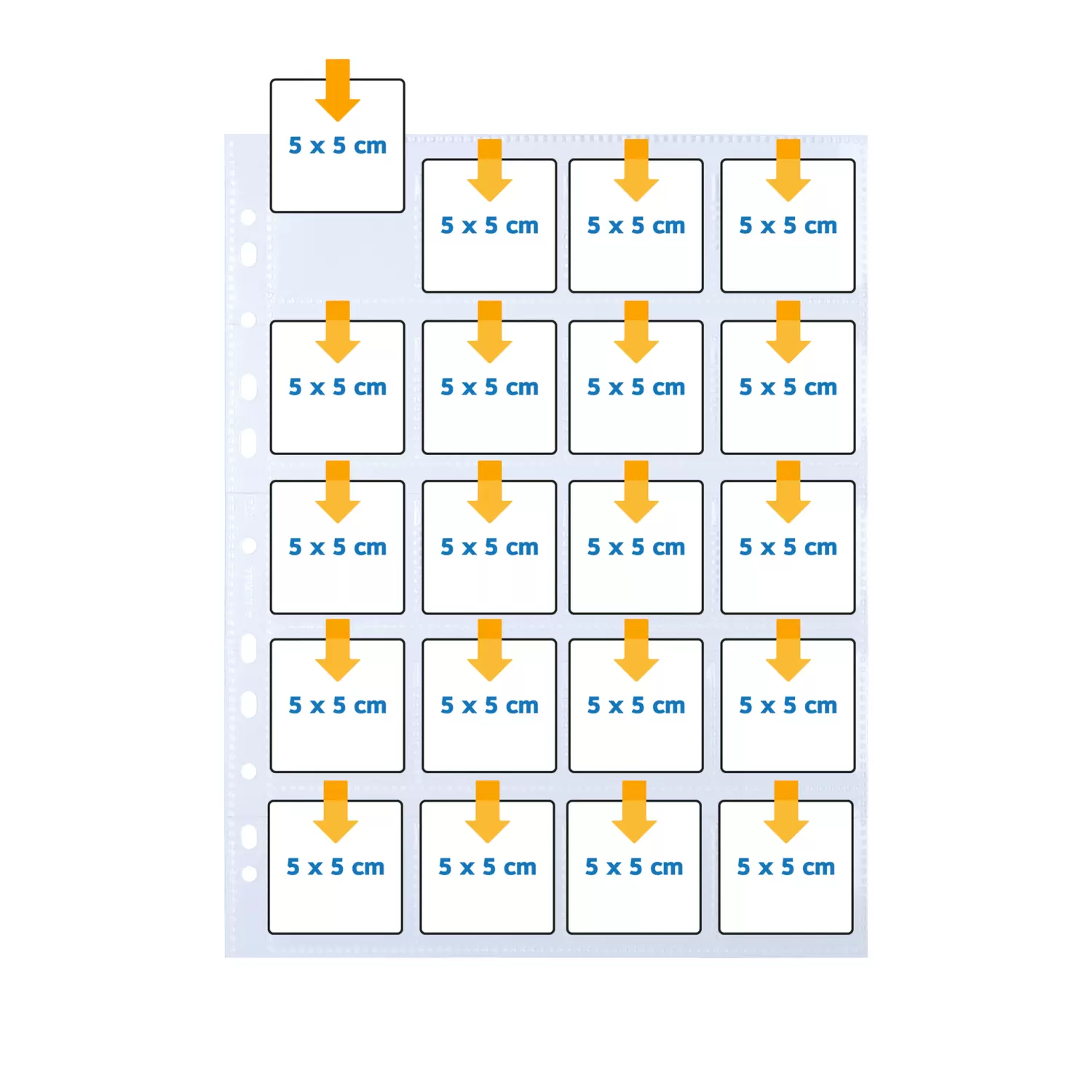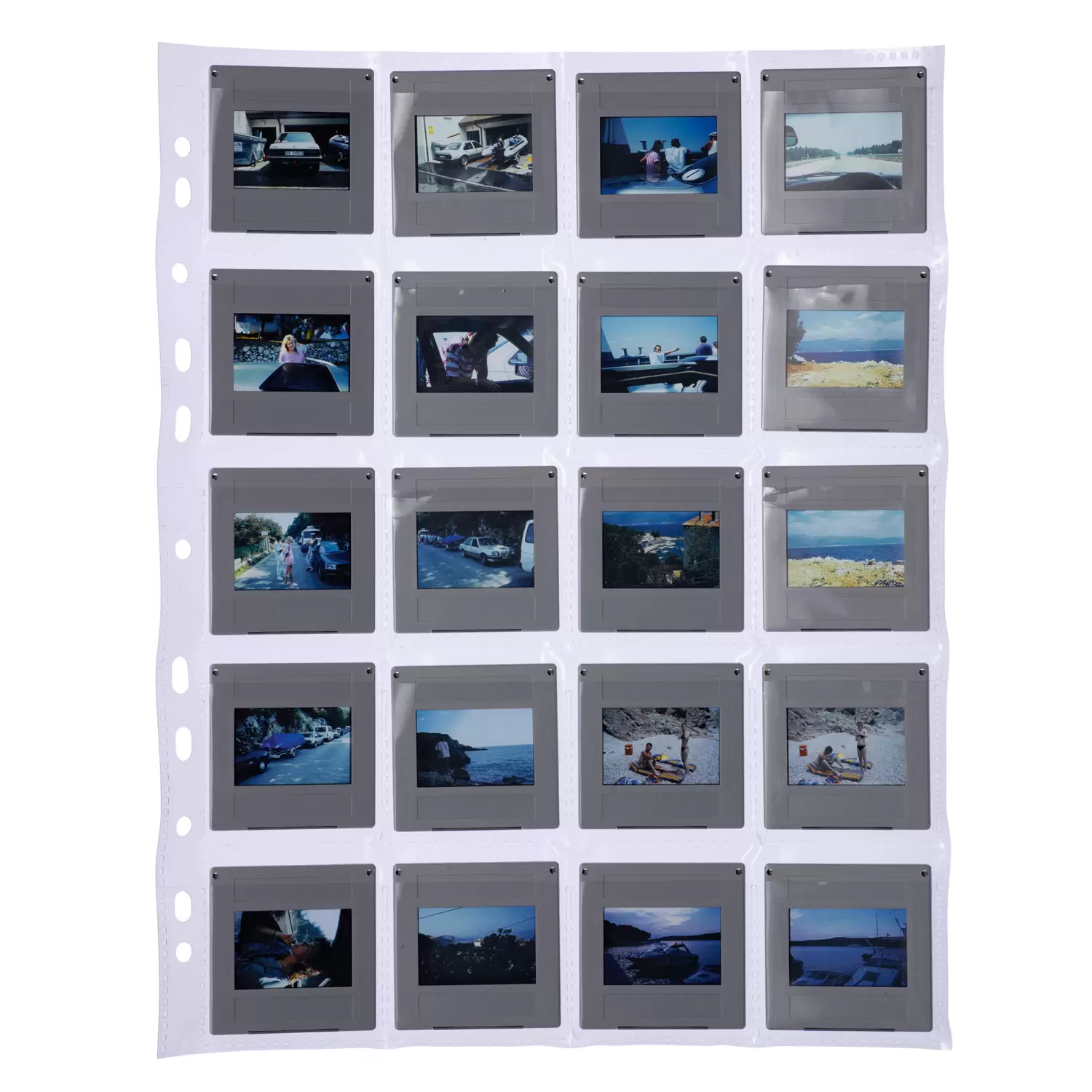 De HERMA diahoesjes zijn ideaal voor het netjes en overzichtelijk bewaren en archiveren van kleinbeeld-dia's. Ze zijn gemaakt van transparant, robuust en weekmakervrij heldermat polypropyleen en bieden per hoesje plek aan 20 ingeraamde dia's van het formaat 50 x 50 mm. Bijzonder eraan zijn de speciale beschermflapjes die voorkomen dat de dia's uit de hoesjes kunnen vallen. Zo kunnen de dia's er gemakkelijk worden ingestoken en uitgenomen en zijn desondanks optimaal beschermd. Een hoesje is ca. 24,4 x 30,1 cm groot en kan dankzij de europerforatie gemakkelijk in ordners, ringbanden of fotoboeken worden opgeborgen. Voor het optimaal vasthouden worden varianten met 4 ringen aanbevolen. Er zitten 100 vellen in een verpakking en dus is er genoeg plek voor max. 2000 dia's.