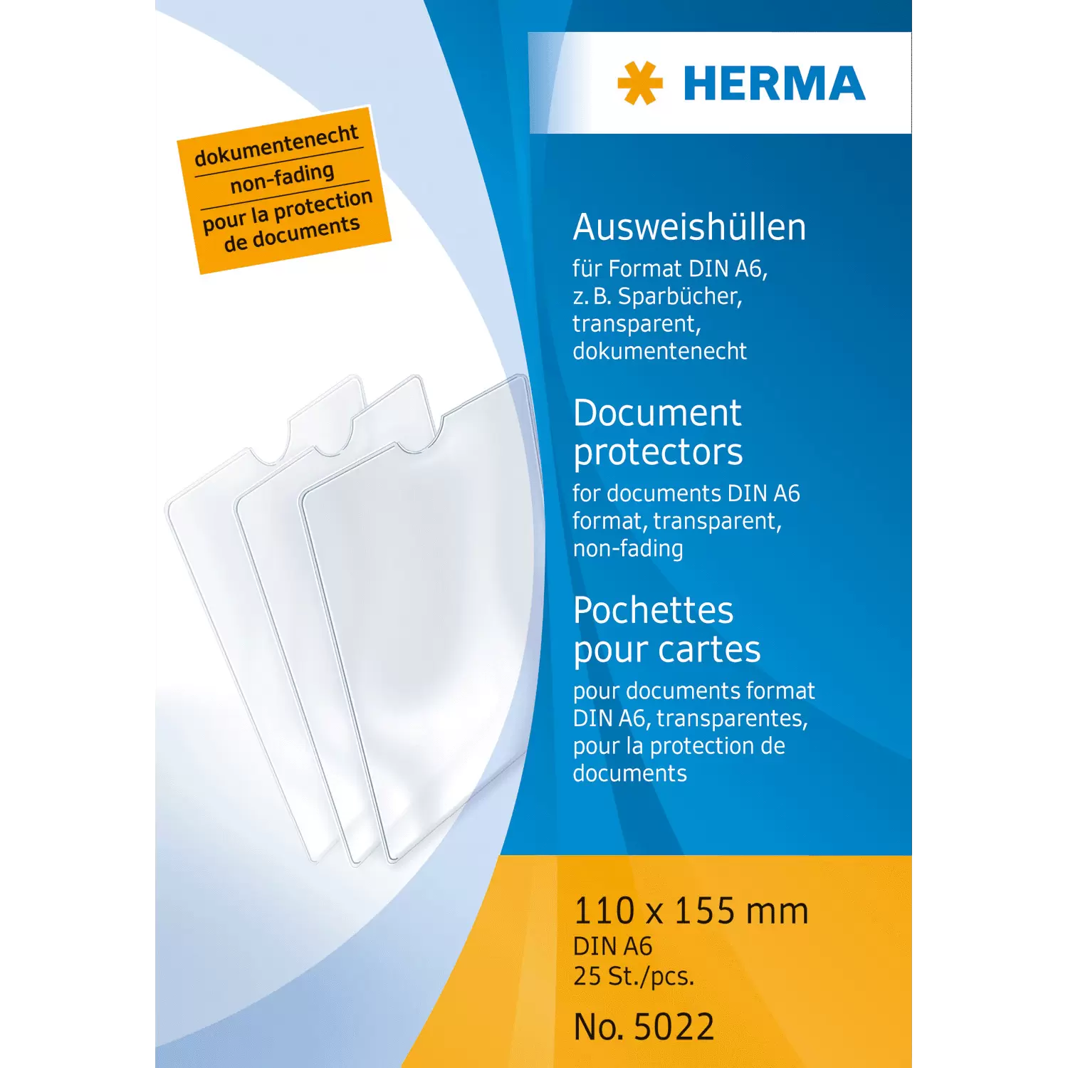Documenten, ID-kaartjes en bankpasjes, creditcards en andere belangrijke pasjes moeten goed beschermd en veilig worden bewaard. Het HERMA insteekhoesje van transparante polypropyleen-folie is optimaal geschikt voor spaarbankboekjes & meer in het formaat DIN A6 (110 x 155 mm). Het hoesje is zeer duurzaam en robuust, documentecht, scheurvast, geurvrij en beschermt tegen vocht, vuil en slijtage, ook onderweg in de portemonnee, in de handtas of broekzak. Dat is HERMA-kwaliteit 'Made in Germany'.