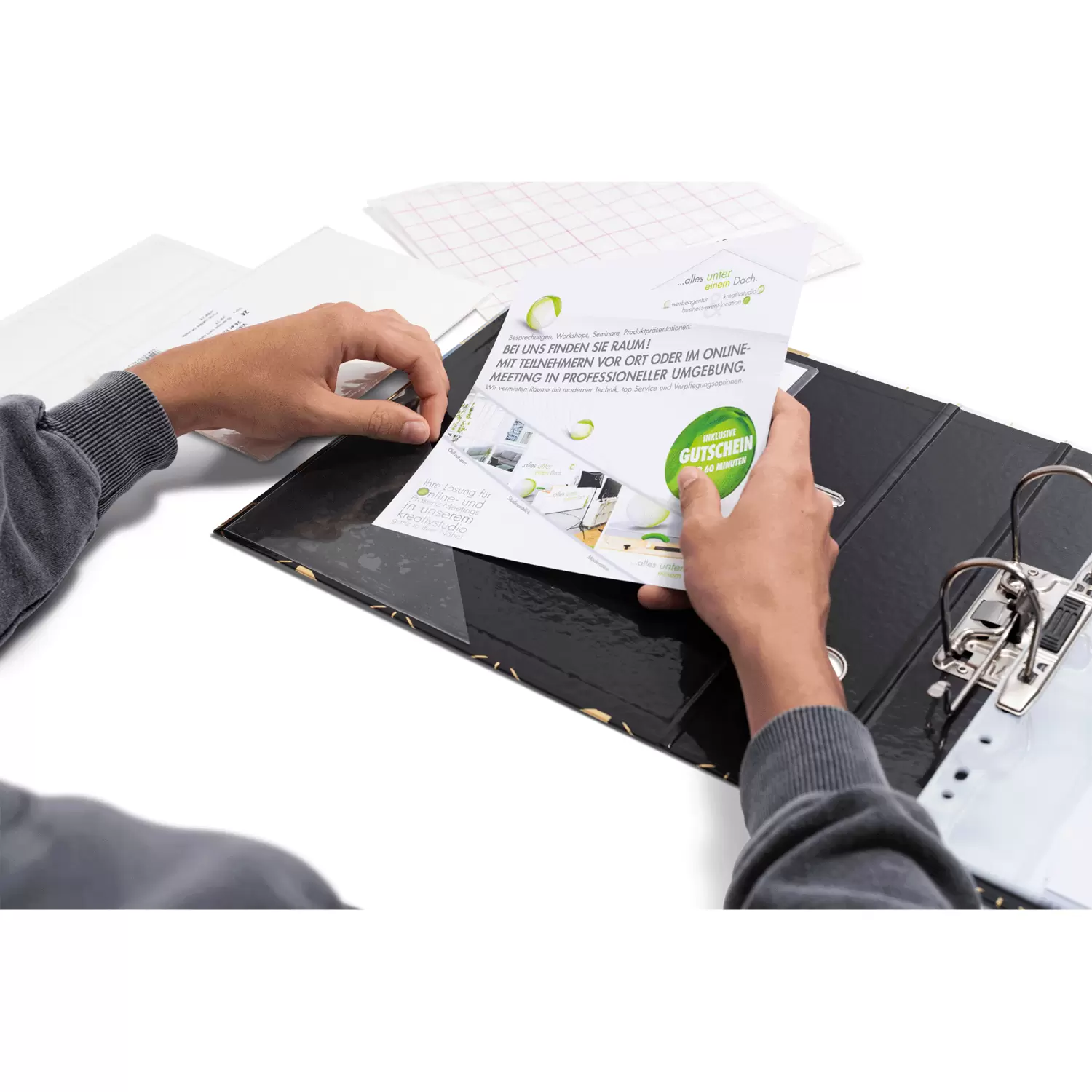 Het praktische extra vak om in albums, ordners en ringmappen, offerte- en presentatiemappen te plakken: de transparante, zelfklevende insteekhoeken van HERMA. De insteekdriehoeken, ook bekend als plakhoekjes of uitleenkaartvakjes, zijn gemaakt van glasheldere polypropyleenfolie, hebben een rugbreedte van 17 cm en zijn daarmee ideaal voor grotere documenten als flyers, brochures en overzichtsbladen. De insteekdriehoeken zijn gemakkelijk aan te brengen, zelfklevend en hechten goed op gladde oppervlakken. Zo zijn documenten die vaak worden gebruikt, zoals kalenders, roosters of to-do-lijstjes, maar ook visitekaartjes of brochures voor zakelijke afspraken, altijd onder handbereik. Gewoon het rugpapier verwijderen, de insteekdriehoek op de gewenste plaats plakken, de papieren erin steken en een nuttig gebruik maken van de tot dan toe ongebruikte plek. Clever en praktisch.
