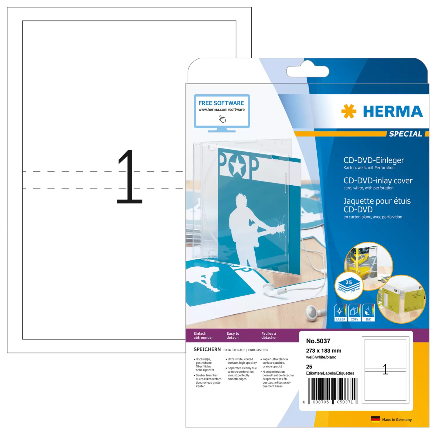 CD- en DVD-inlegger van karton, niet klevend. Zo past het hoesje perfect bij het etiket - professioneel uiterlijk voor elke cd of DVD. Deksel- en ruginlegger op één vel, in één drukgang bedrukken - klaar. Helderwit, gestreken speciaal karton met hoge dekkracht. Netjes af te scheuren dankzij de microperforatie, nagenoeg gladde randen. Zeer goede drukresultaten op alle laserprinters, kopieerapparaten, kleurenlaserprinters en kleurenkopieerapparaten. Gratis softwareoplossingen: www.herma.com/software.