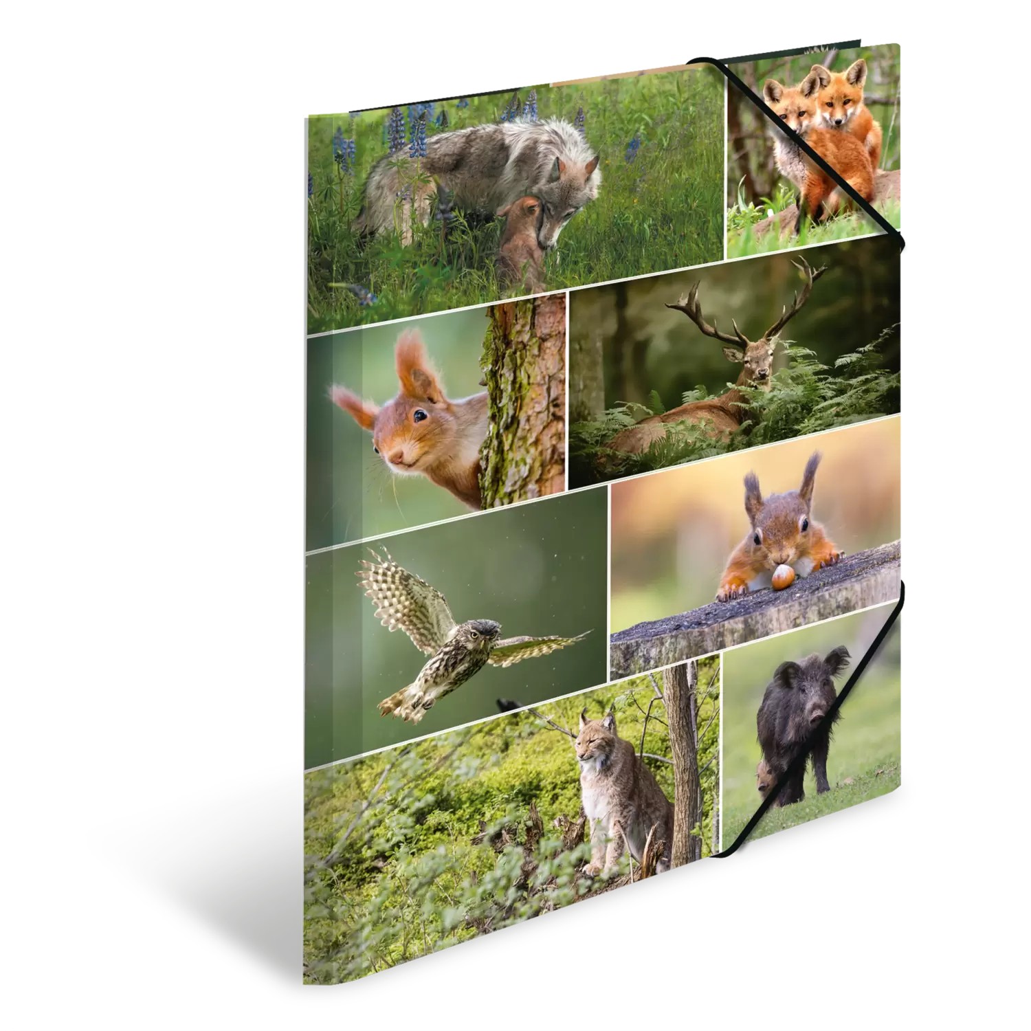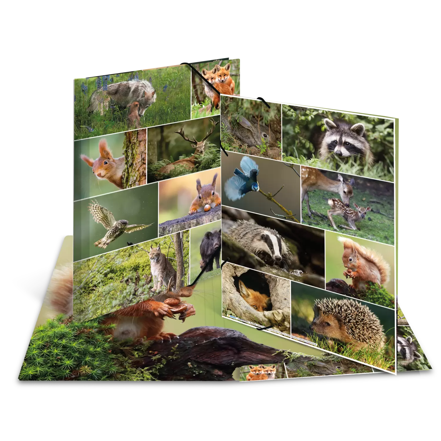Bosliefhebbers opgelet! Wie van dieren houdt en graag zijn tijd doorbrengt in de natuur, in het bos of buiten in het veld, zal veel plezier beleven aan deze verzamelmap, die aan de binnen- en buitenkant bedrukt is met veel verschillende foto's van bosdieren. Van de partij zijn eekhoorns, vossen, reeën, hazen en nog veel meer! De map meet 44 cm x 33,5 cm en is dus groot genoeg voor papieren, tekeningen en documenten tot een formaat van DIN A3. Hij is gemaakt van stevig karton en dankzij twee hoogwaardige hoekspanners gemakkelijk te openen en te sluiten. Dankzij de drie binnenflappen wordt de inhoud beschermd en ook kleiner papierwerk kan er niet uit vallen.