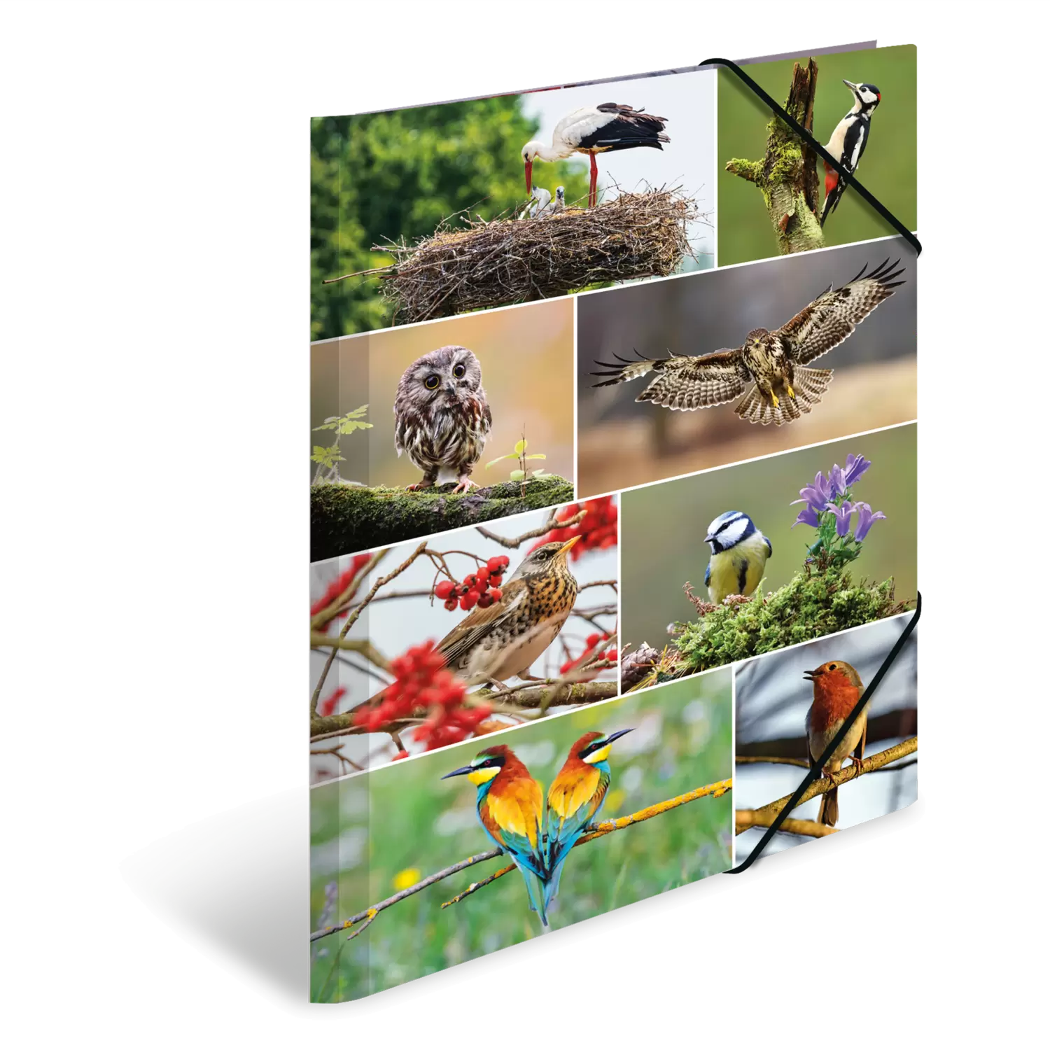 Vogelvrienden opgelet! Wie dol is op vogels en graag zijn tijd met een verrekijker doorbrengt in de natuur, in het bos of buiten in het veld om vogels te spotten, zal veel plezier beleven aan deze verzamelmap, die aan de binnen- en buitenkant bedrukt is met veel verschillende foto's van vogels. De map meet 44 cm x 33,5 cm en is dus groot genoeg voor papieren, tekeningen en documenten tot een formaat van DIN A3. Hij is gemaakt van stevig karton en dankzij twee hoogwaardige hoekspanners gemakkelijk te openen en te sluiten. Dankzij de drie binnenflappen wordt de inhoud beschermd en ook kleiner papierwerk kan er niet uit vallen.