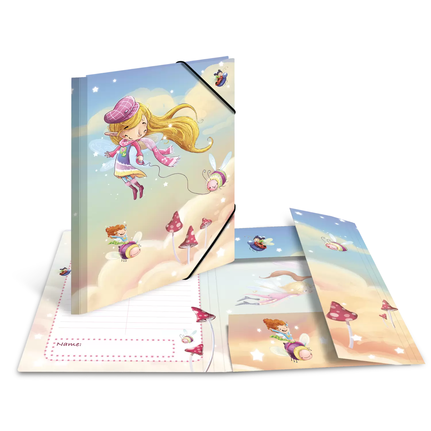 De HERMA verzamelmap met het schattige motief „feeëndans“ is de ideale hulp om orde te scheppen in tekeningen en foto's van de kleinste kunstenaars onder ons. Zo kunnen de kunstwerkjes voor oma en opa, tantes en ooms en alle andere familieleden praktisch worden opgeborgen. Het schattige design met kleine feeën en grappige kevertjes is uitgevoerd in zachte pasteltinten en versierd met wolken en sterren. De verzamelmap heeft het formaat 440 mm x 335 mm, zodat foto's en tekeningen tot een formaat van DIN A3 netjes kunnen worden opgeborgen. Het stevige karton, waarvan de opbergmap gemaakt is, is gemakkelijk afwasbaar en uiterst slijtvast. De hoogwaardige hoekspanners zorgen ervoor dat er geen blaadjes uit kunnen vallen en zoek kunnen raken. Het bijzondere aan de map is de binnenkant met print die qua motief past bij de buitenkant, met naamveld en register. Zo kan elk kunstwerk op datum en titel worden bewaard. Voor kleinere kunstwerkjes is het assortiment er ook in het formaat DIN A4 met dezelfde motieven.