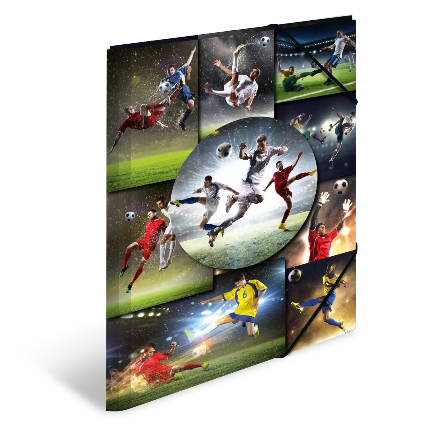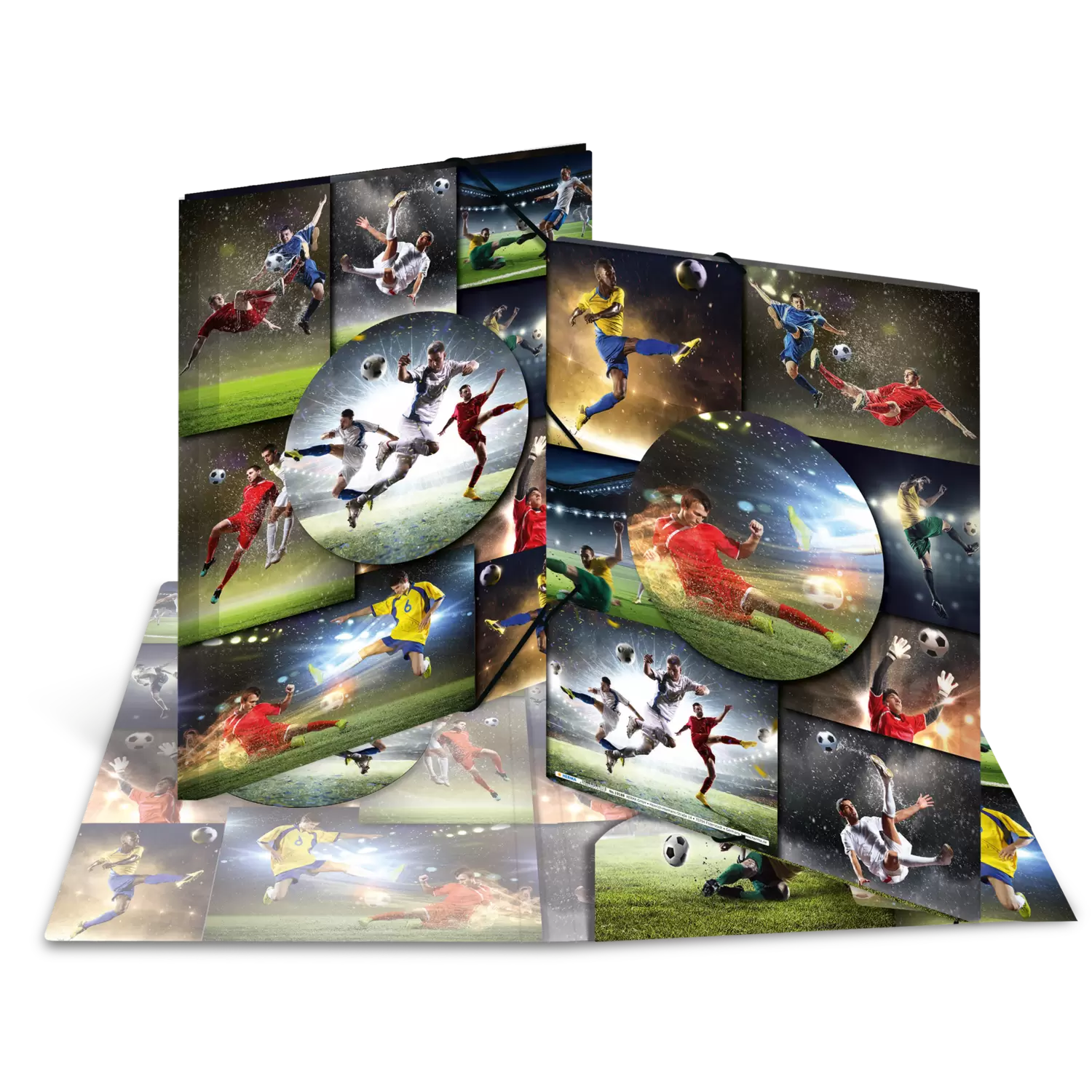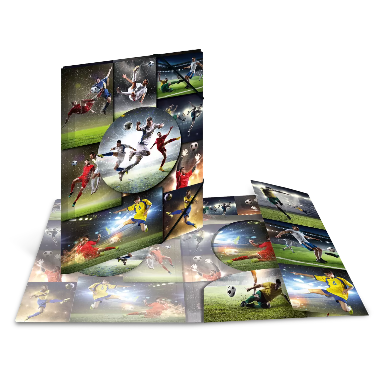 Rondom sportief de verzamelmap met elastieken band en inslagflappen in voetbaldesign. Gemaakt van stabiel polypropyleen in het formaat A3. Ideaal voor het bewaren van losse paperassen