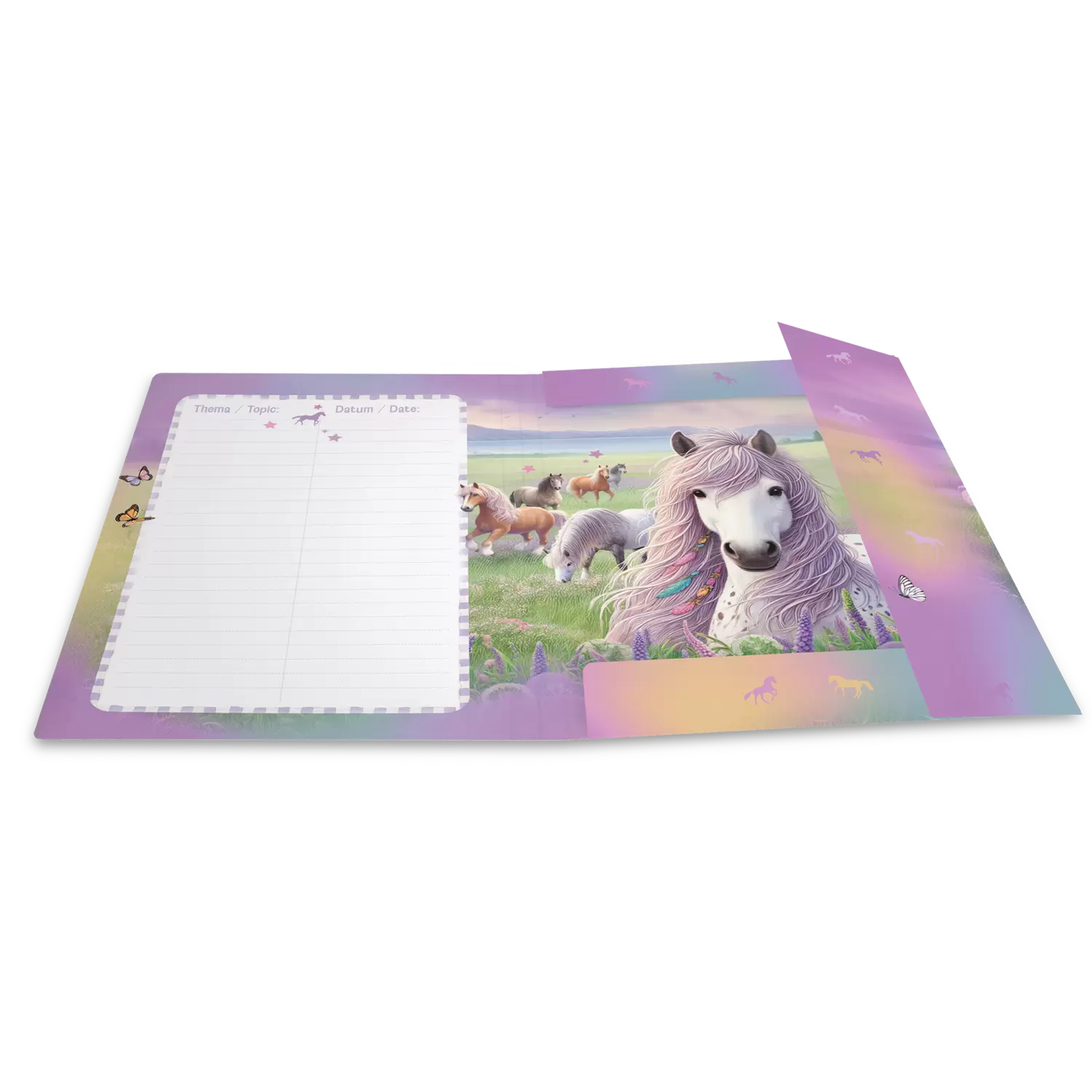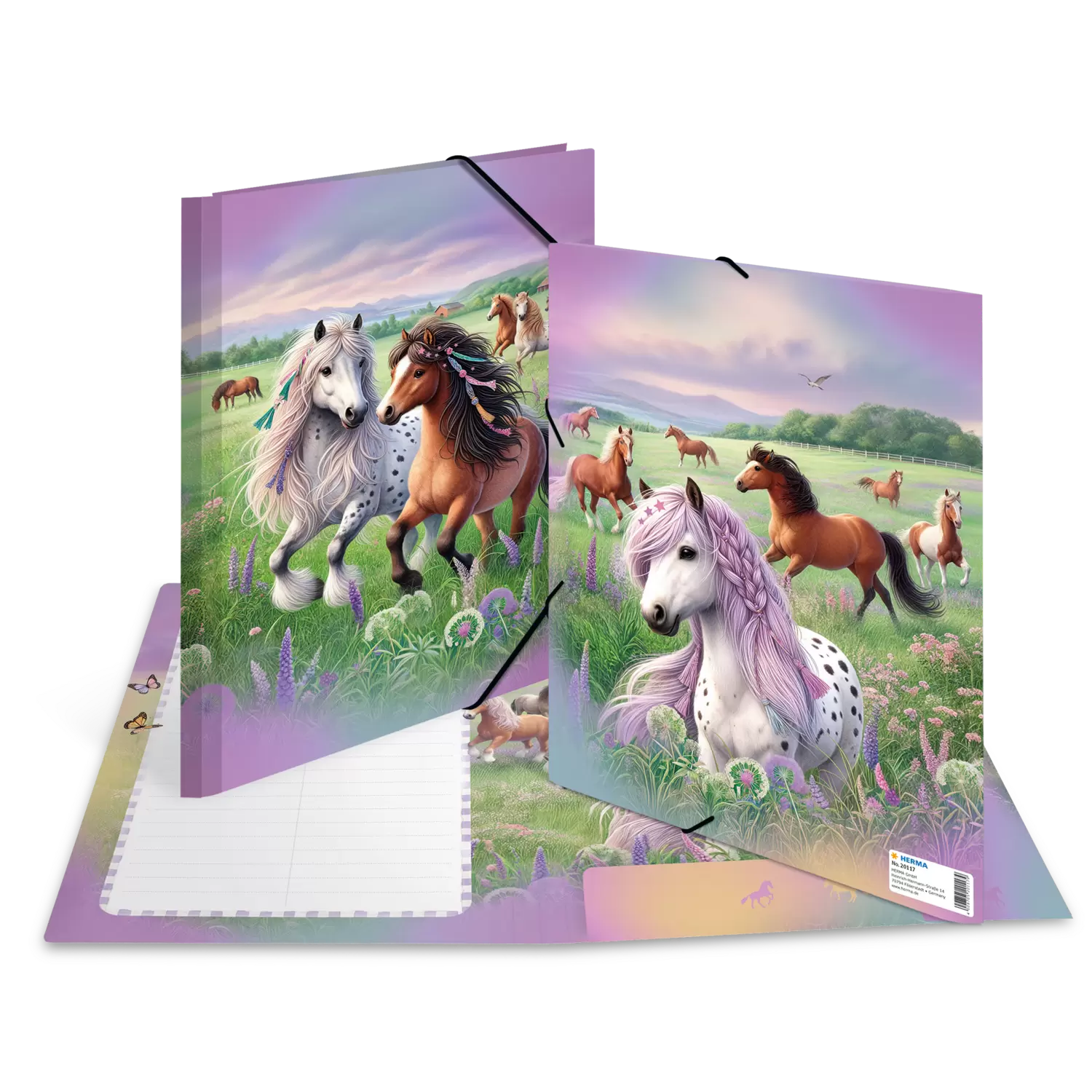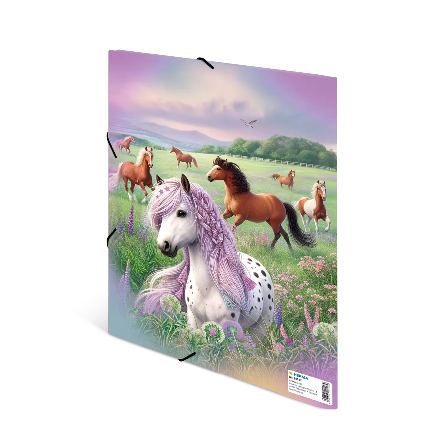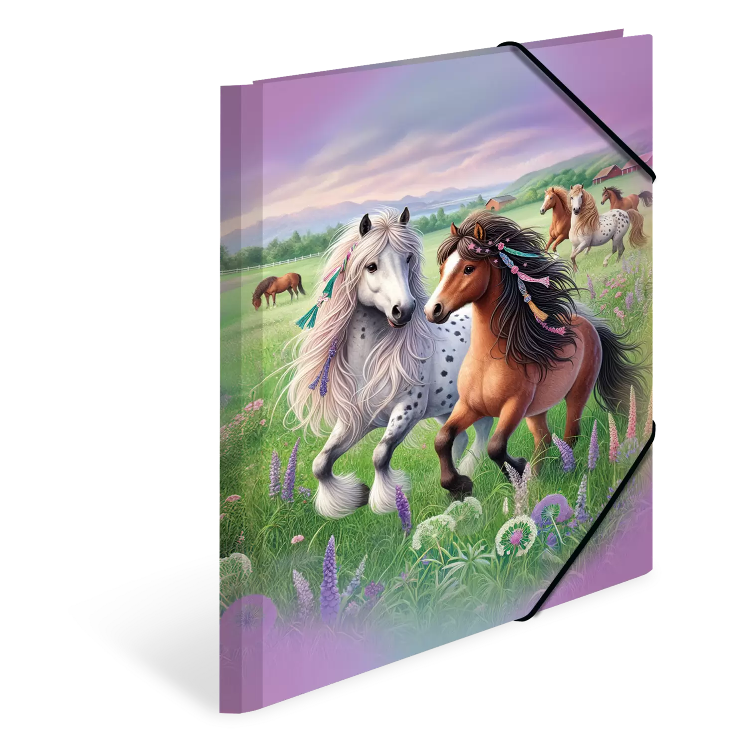 - Geschikt voor formaten tot DIN A4, van stevig karton, met elastieken hoekspanners en 3 binnenflappen met print