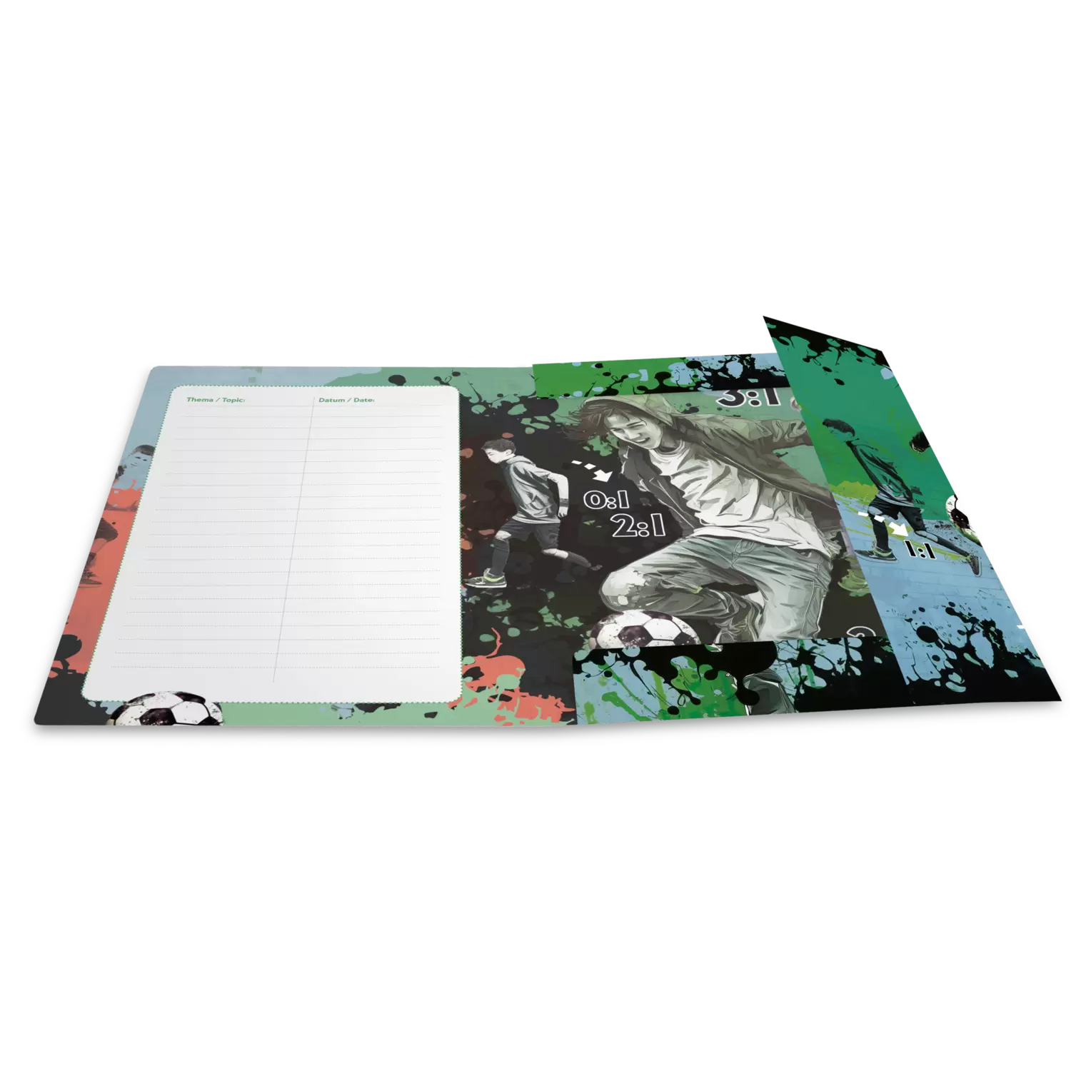 Voetbal is onze lust en ons leven! Maar alleen de diehards spelen op straat. Met zijn trendy ontwerp "Street Soccer" is deze verzamelmap een echte blikvanger die meteen uitnodigt een balletje te gaan trappen. Praktisch en robuust - dat is kwaliteit van HERMA. De map meet 32 cm x 24 cm en is dus groot genoeg voor papieren, tekeningen en documenten tot DIN A4-formaat. Hij is gemaakt van stevig karton en dankzij twee hoogwaardige hoekspanners gemakkelijk te openen en te sluiten. Dankzij de drie binnenflappen wordt de inhoud beschermd en ook kleiner papierwerk kan er niet uit vallen.