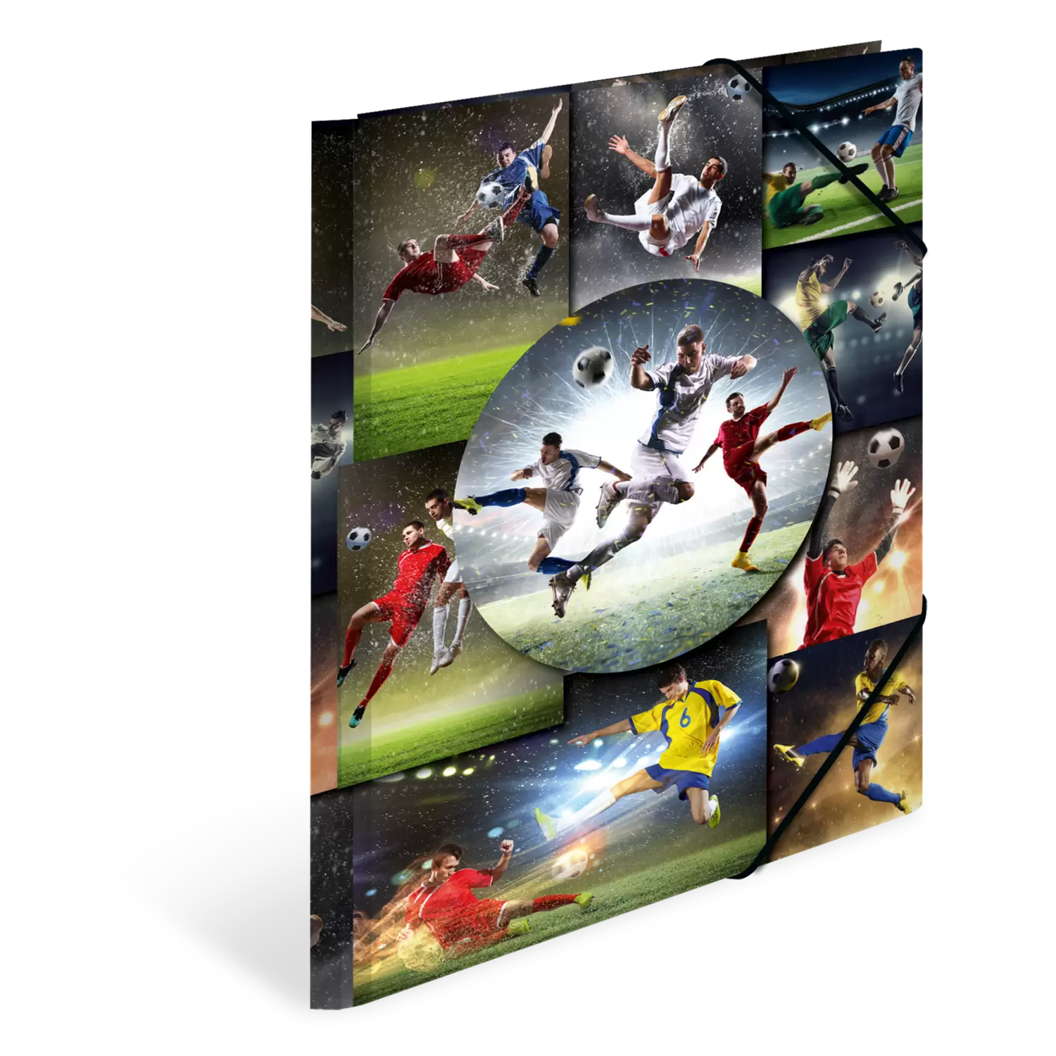Rondom sportief de verzamelmap met elastieken band en inslagflappen in voetbaldesign. Van stevig karton in het formaat A4. Ideaal voor het bewaren van losse paperassen.