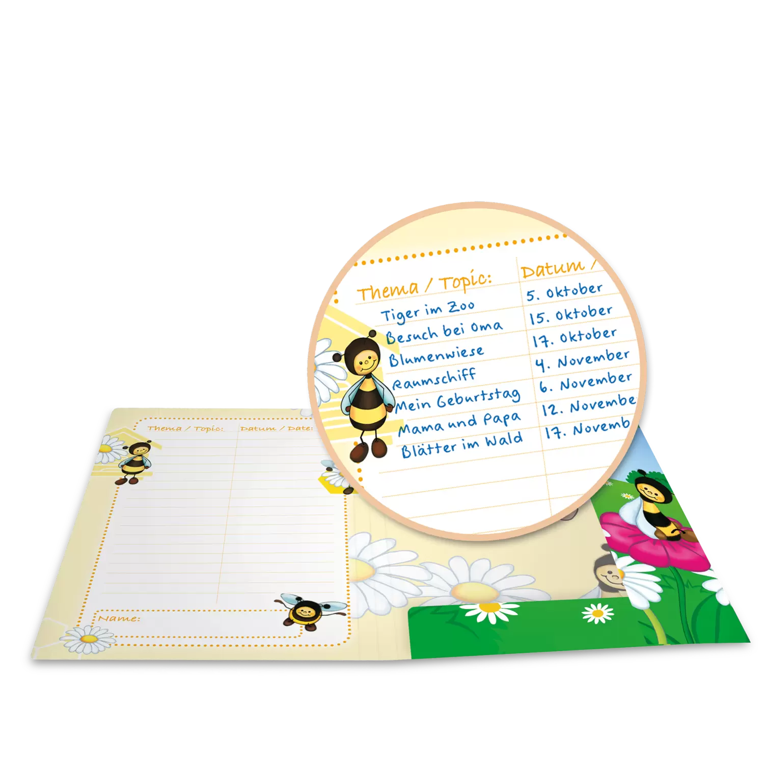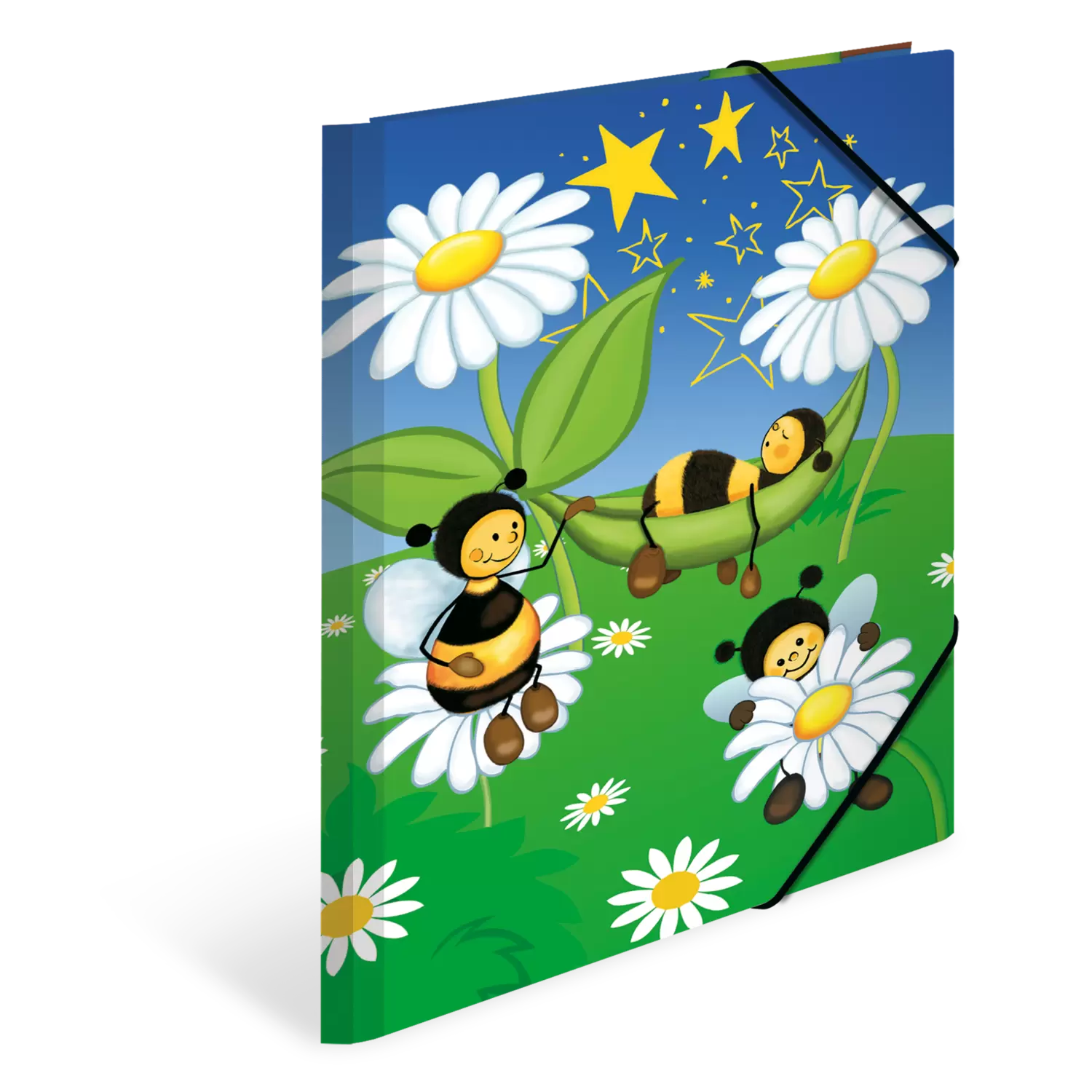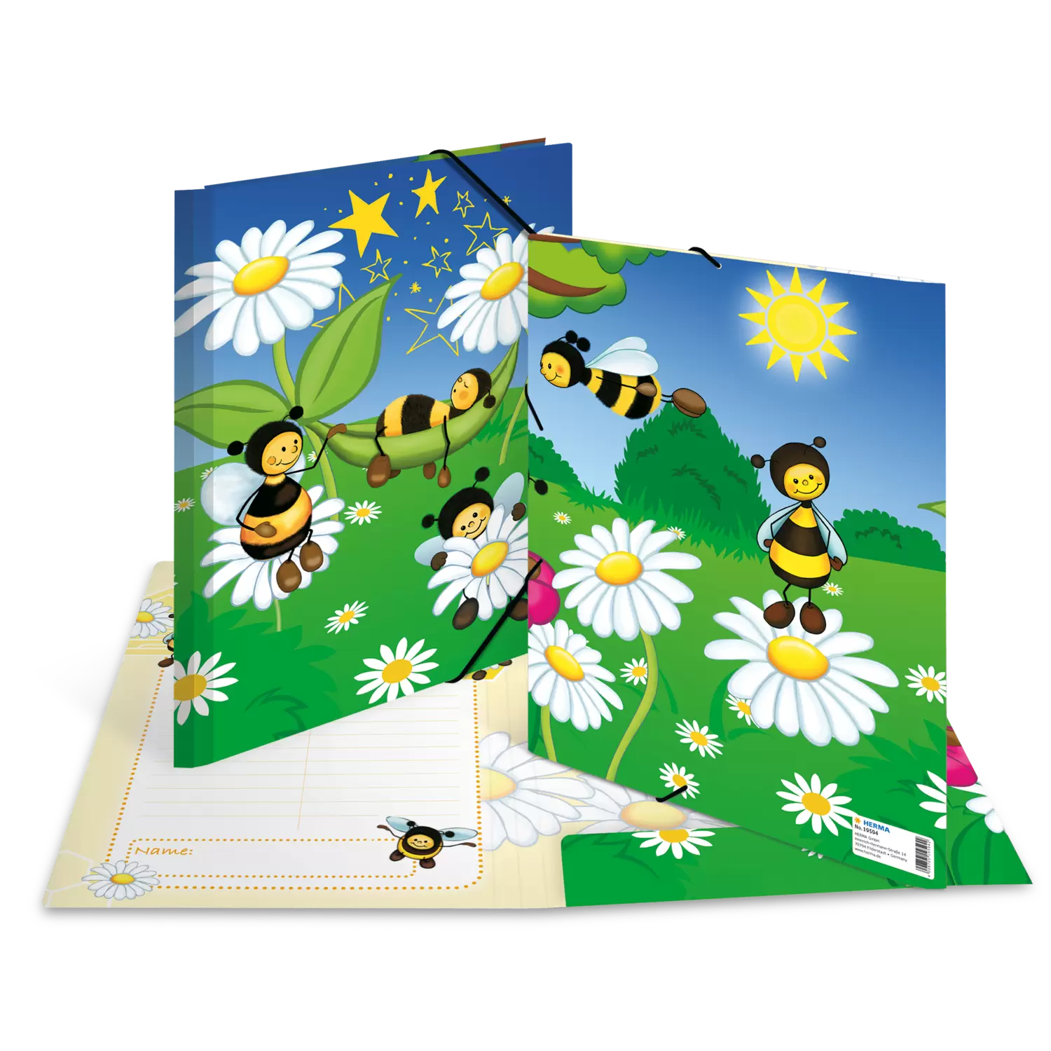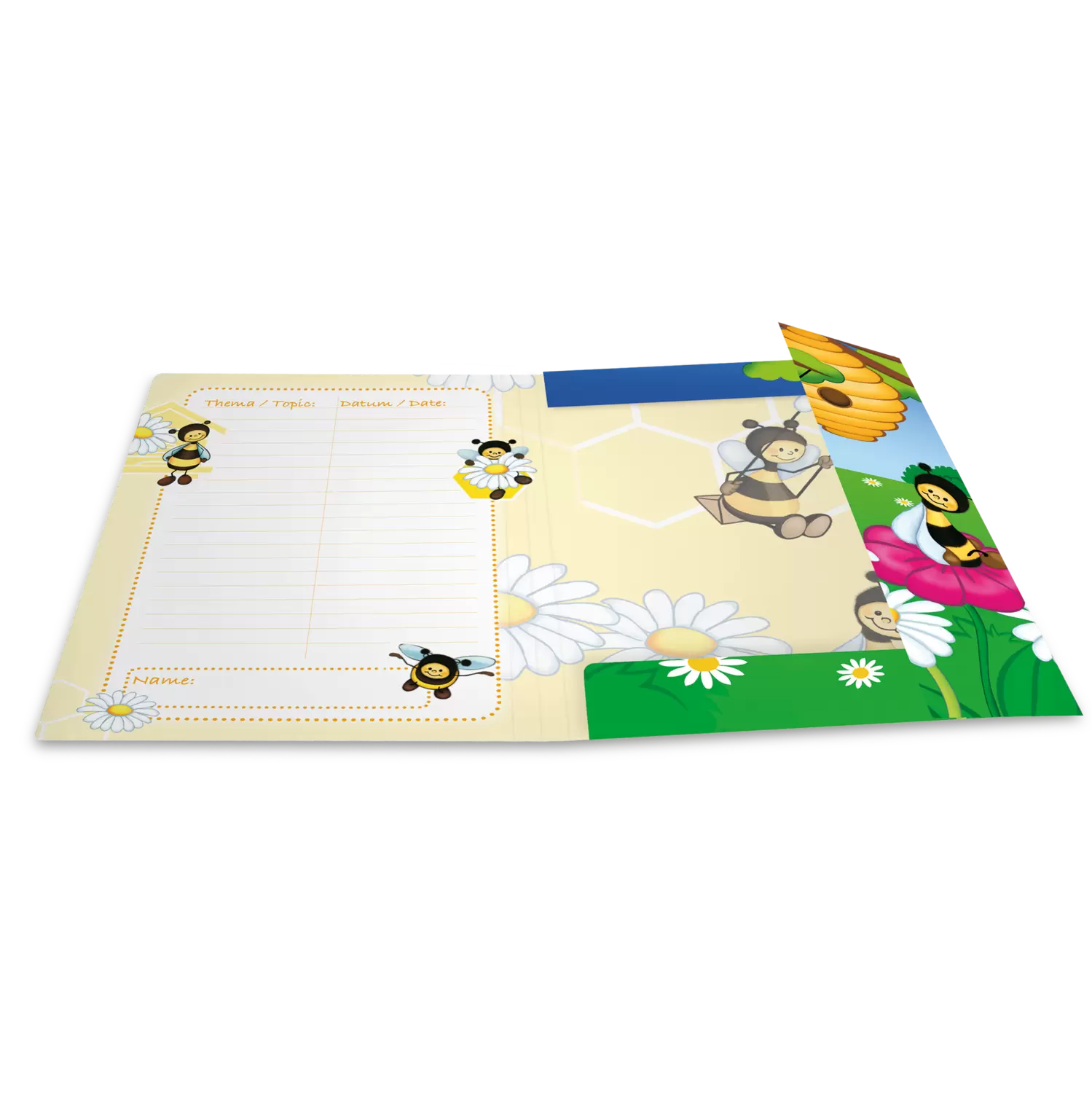 De vlijtige bijen zoemen vrolijk over de weide, langs prachtige bloemen en door sappig groene stengels. Het liefdevol vormgegeven motief maakt de kleintjes en de allerkleinsten blij. De map meet 32 cm x 24 cm en is dus groot genoeg voor papieren, tekeningen en documenten tot DIN A4-formaat. Hij is gemaakt van stevig karton en dankzij twee hoogwaardige hoekspanners gemakkelijk te openen en te sluiten. Dankzij de drie binnenflappen wordt de inhoud beschermd en ook kleiner papierwerk kan er niet uit vallen.