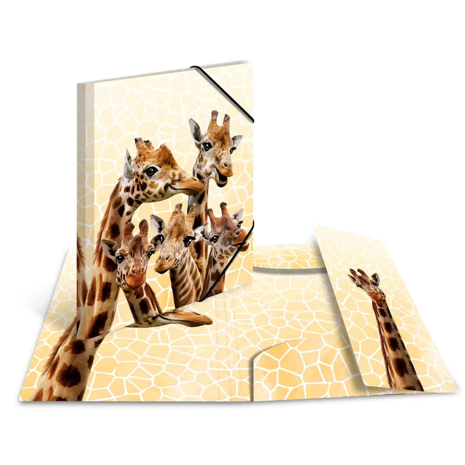 De verzamelmap diermotieven met giraffenvriendjes van HERMA, met kleurige binnendruk, is uitstekend geschikt voor alle dierenliefhebbers die houden van orde én een vrolijke uitstraling. De verzamelmap heeft een onopvallende achtergrond met vachttekening, zodat de giraffen met hun mooie ogen en de lange wimpers als ware eyecatchers op de voorgrond staan. De verzamelmap behoort met nog 4 andere mappen met diermotieven tot de serie 'exotische dierenwereld', die gegarandeerd zorgt voor vrolijkheid en alles biedt wat scholieren en studenten nodig hebben, om belangrijke papieren en kunstwerken gemakkelijk en snel op te bergen. Voorzien van kwalitatief hoogwaardige hoekspanners die de inhoud zo goed bij elkaar houden dat deze er niet uit kan vallen en kwijt kan raken. Ook zijn papieren optimaal beschermd tegen vies worden buiten, omdat de verzamelmap van HERMA beschikt over drie geïntegreerde binnenflappen. Bovendien is hij uiterst slijtvast en afwasbaar. De map is gemaakt van stevig polypropyleen en helpt zo orde en overzicht van de meest uiteen lopende paperassen te bewaren. Door zijn formaat kan de verzamelmap gemakkelijk van het werk of van school mee naar huis worden genomen, hij past probleemloos in de rugzak, de schooltas of de aktetas. Andere motieven zijn de koala-familie, het stelletje tropische vogels, de apenbende en de stokstaartjesgroep. Hij heeft het formaat 320 mm x 240 mm, zodat foto's, documenten en tekeningen tot een formaat van DIN A4 netjes kunnen worden opgeborgen. Het bijzondere aan de mappen zijn de binnenkanten met print die qua motief passen bij de buitenkant. Voor grotere kunstwerken en documenten is het assortiment er ook in het formaat DIN A3 met dezelfde motieven.
