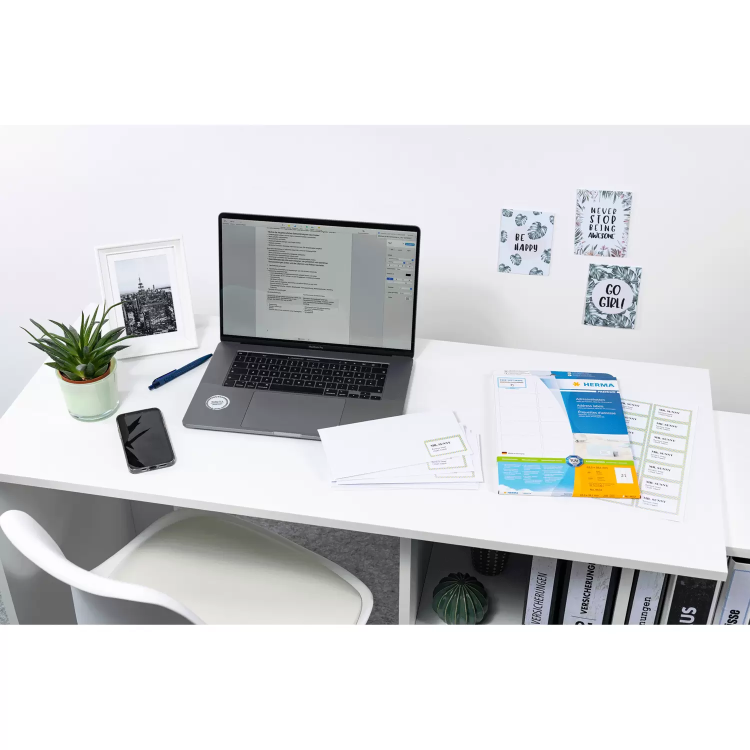 Zelfklevende etiketten op A4-vellen, permanent hechtend. Perfect voor alle laser- en inkjetprinters, kopieerapparaten, kleurenlaserprinters en kleurenkopieerapparaten. Gegarandeerd storingvrije loop en geschikt voor high-speed dankzij extra sterke speciale materiaalsamenstelling, top-vlakligging en een veiligheidsrand rondom. Probleemloze doorvoer door de printer voor laserprinters en inkjetprinters getest en bevestigd door de TÜV SÜD. Hoge witheidsgraad en gelijkmatig oppervlak voor de beste afdrukresultaten in zwart/wit en kleur. Voelbaar dikker: extra dikke etiketten, eenvoudig opplakken. Zeer snel en goed hechtend, ook op koude en vochtige oppervlakken. Milieuvriendelijk en duurzaam: chloorvrij gebleekt, FSC® Mix Credit-gecertificeerd, oplosmiddelvrije contactlijm. Etikettenmateriaal recyclebaar via het oud papier, gooi rugpapier bij het restafval weg, verpakking van gerecycled karton. Gratis softwareoplossingen: www.herma.com/software.