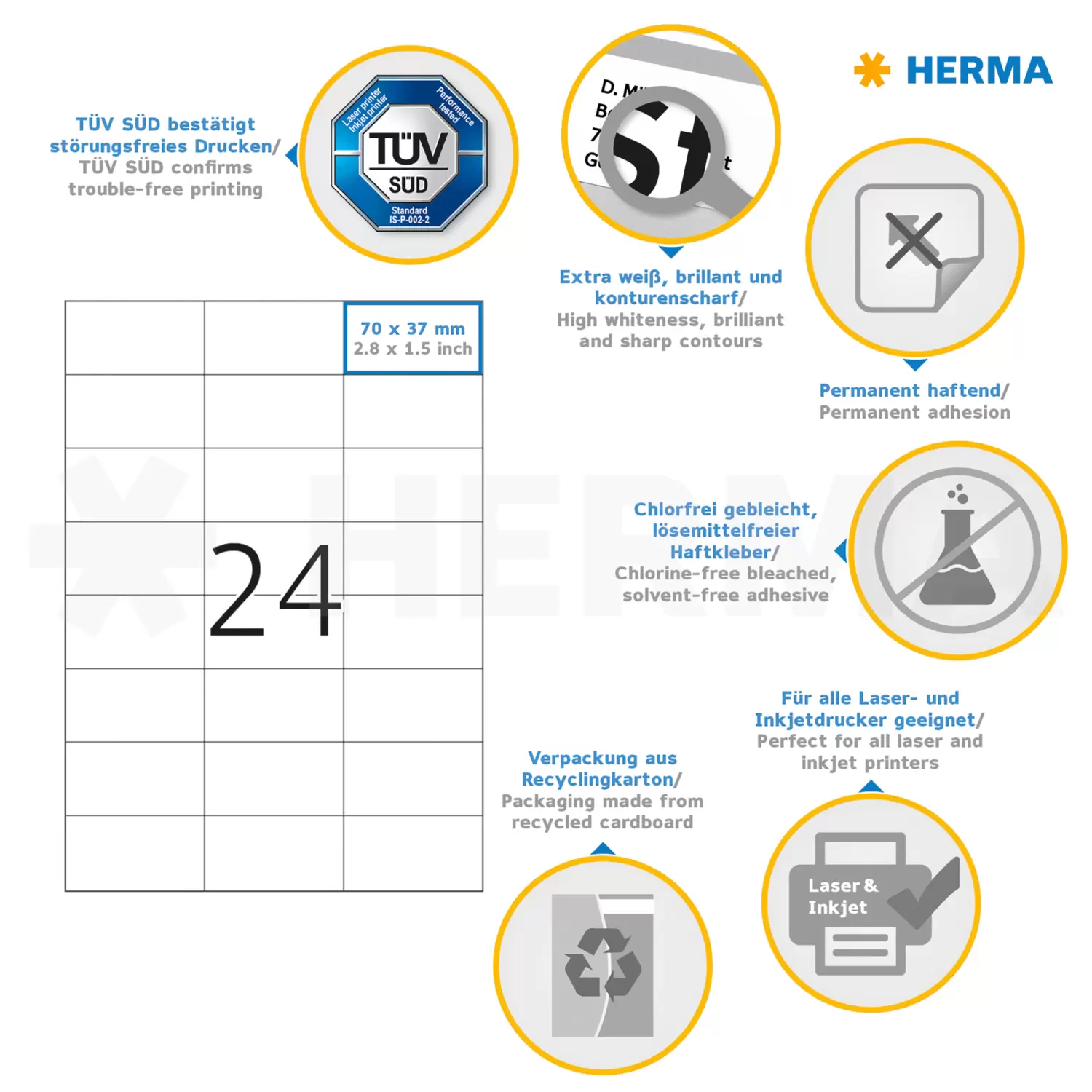 Zelfklevende etiketten op A4-vellen, permanent hechtend. Perfect voor alle laser- en inkjetprinters, kopieerapparaten, kleurenlaserprinters en kleurenkopieerapparaten. Gegarandeerd storingvrije loop en geschikt voor high-speed dankzij extra sterke speciale materiaalsamenstelling, top-vlakligging en een veiligheidsrand rondom. Probleemloze doorvoer door de printer voor laserprinters en inkjetprinters getest en bevestigd door de TÜV SÜD. Hoge witheidsgraad en gelijkmatig oppervlak voor de beste afdrukresultaten in zwart/wit en kleur. Voelbaar dikker: extra dikke etiketten, eenvoudig opplakken. Zeer snel en goed hechtend, ook op koude en vochtige oppervlakken. Milieuvriendelijk en duurzaam: chloorvrij gebleekt, FSC® Mix Credit-gecertificeerd, oplosmiddelvrije contactlijm. Etikettenmateriaal recyclebaar via het oud papier, gooi rugpapier bij het restafval weg, verpakking van gerecycled karton. Gratis softwareoplossingen: www.herma.com/software.