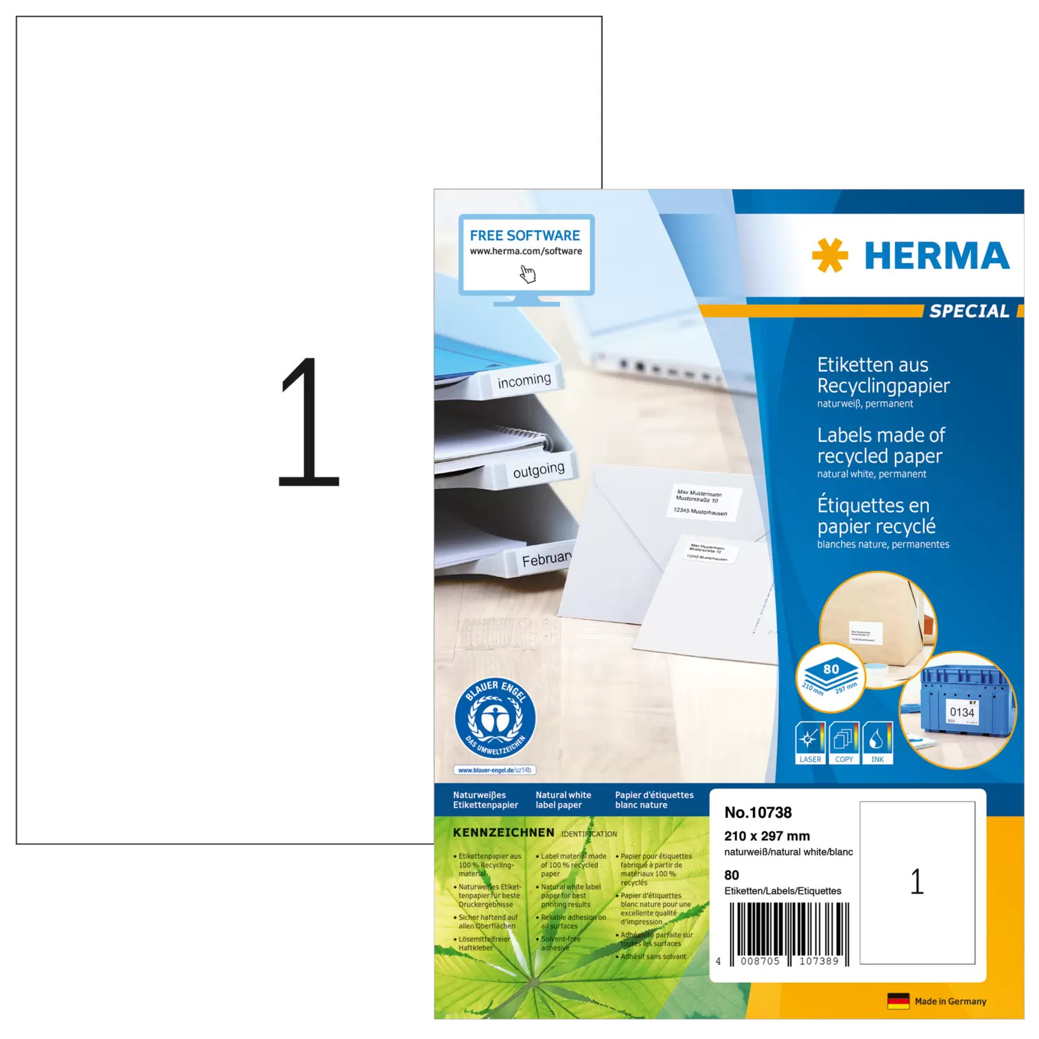 Etiketten van gerecycled papier, A4, 210 x 297 mm, wit, permanent hechtend