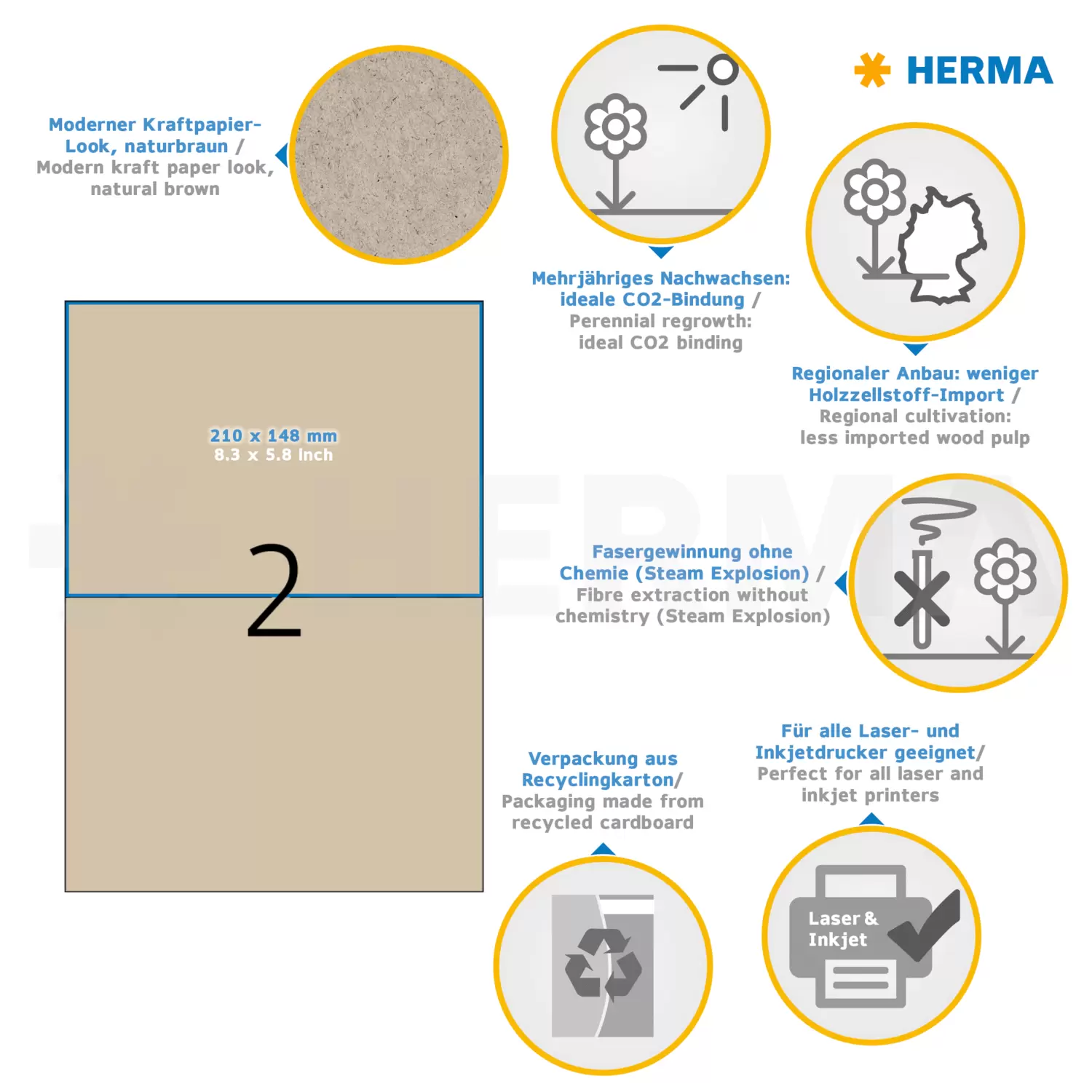 Het speciale papier gemaakt van de koningin van de ecologische gewassen – de Donau Silphie. Habitat voor bijen, voor energiewinning, ideale CO2-vastlegging en een meerwaarde voor het ecosysteem. Een bijdrage aan duurzaamheid. FSC® Mix Credit-gecertificeerd. Teelt in Duitsland, korte transportwegen, minder CO2-uitstoot. Moderne kraftpapier-look, van ten minste 35% silphie-vezels. (Kleurtoonvariaties mogelijk door milieuvriendelijke grondstoffen). Geschikt voor direct contact met levensmiddelen. Etikettenpapier recyclebaar via het oud papier. Van etiket tot verkoopverpakking: rondom duurzaam. Zeer goede drukresultaten op alle laser- en inkjetprinters, kopieerapparaten, kleurenlaserprinters en kleurenkopieerapparaten. Gratis softwareoplossingen: www.herma.com/software.