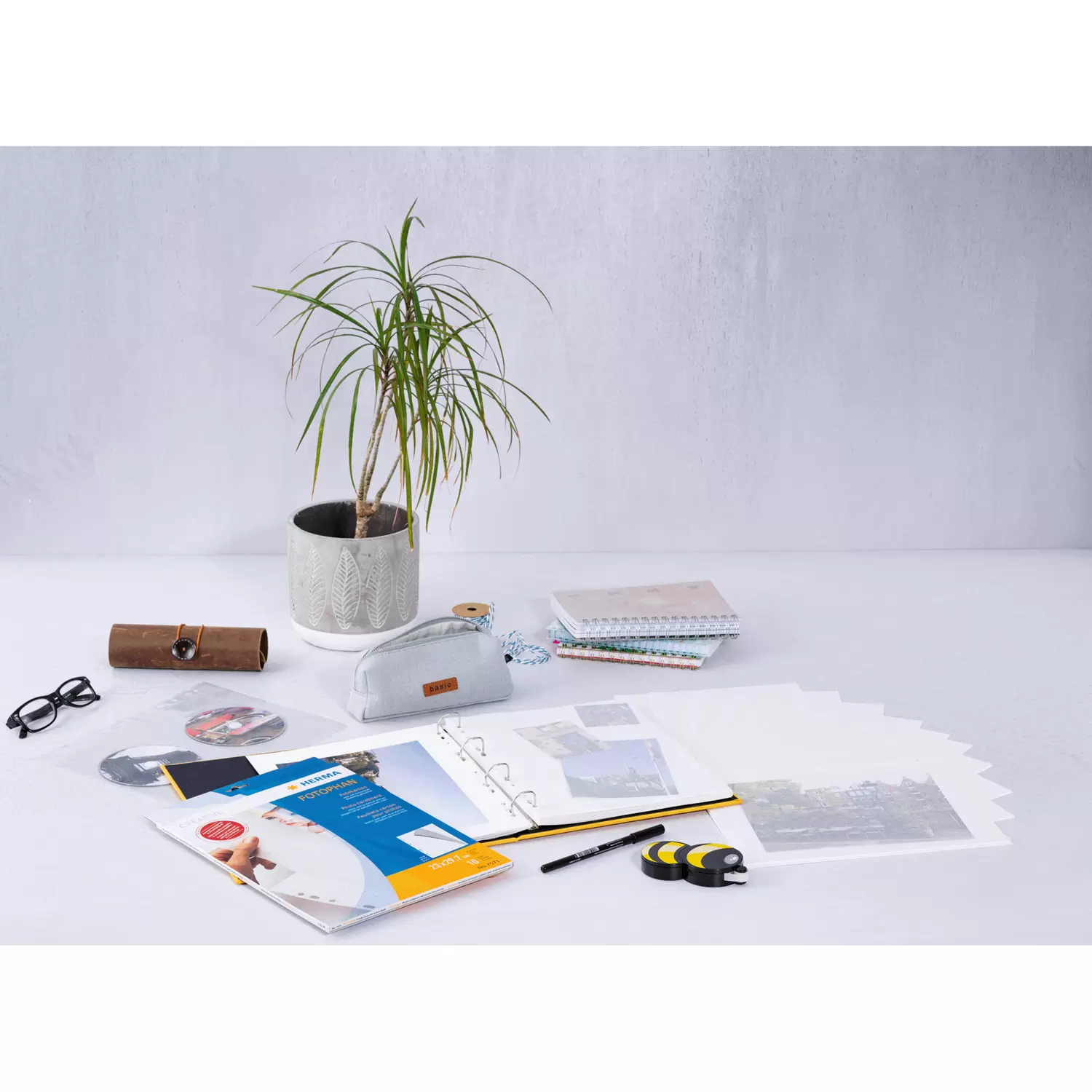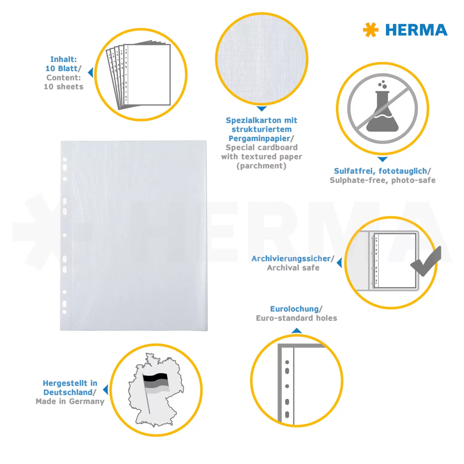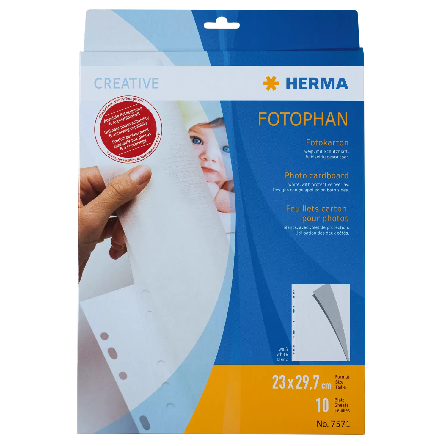 HERMA Fotokarton in het formaat 23 x 29,7 cm is ideaal geschikt om foto's, prenten, ansichtkaarten, krantenartikelen en nog veel meer gedurende lange tijd veilig en op een visueel aantrekkelijke manier te bewaren. Het speciale karton is heel stevig, zodat de bladzijden niet buigen of omkrullen en het aangelijmde pergamijnpapier, een semi-transparant schutblad, is sulfaatvrij en beschermt de foto's extra. Bovendien kunnen de Fotokarton-bladen aan weerszijden worden gebruikt. Dankzij de praktische europerforatie kunnen ze in alle gebruikelijke fotoboeken en fotoalbums, ordners en ringbanden worden opgeborgen. Elke verpakking bevat 10 vel, wit. Voor het inplakken zijn de HERMA lijmdispensers, fotolijmen en fotohoekjes het best geschikt.