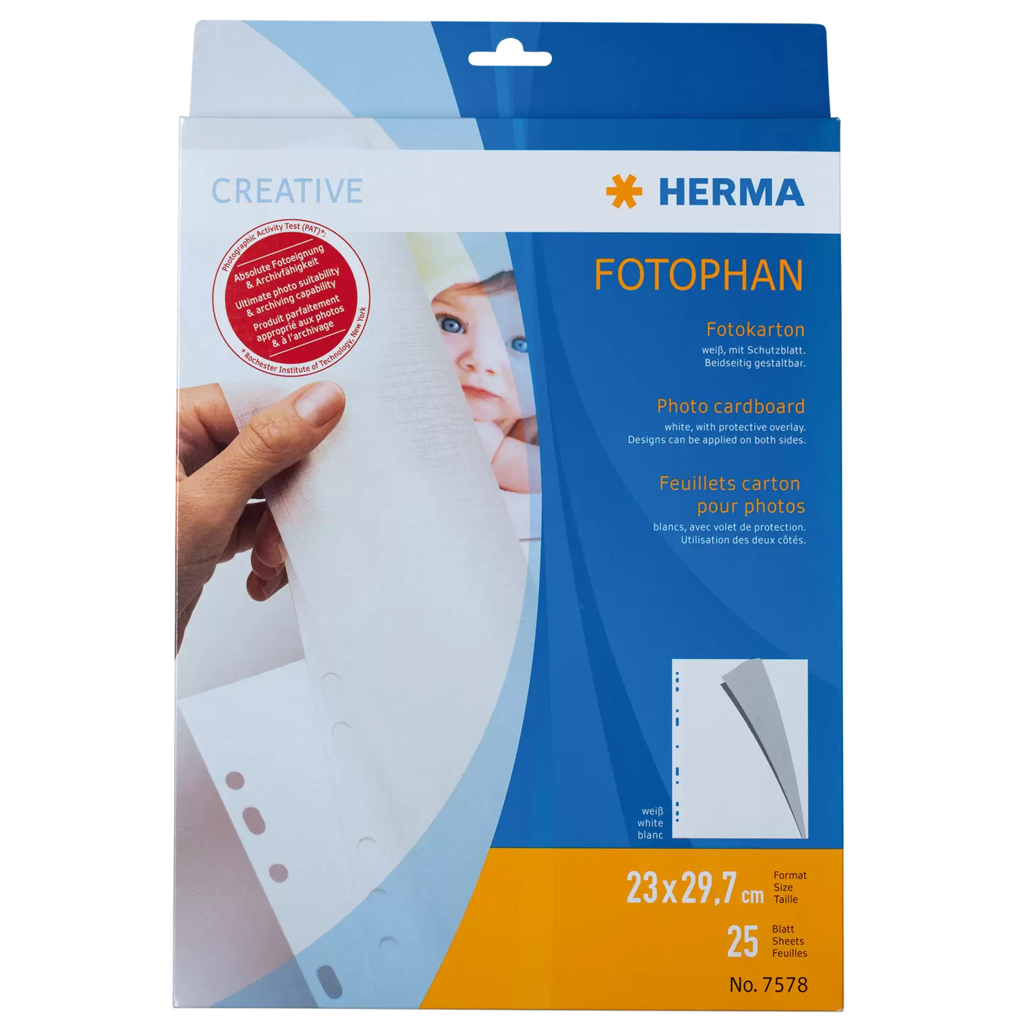 HERMA Fotokarton in het formaat 23 x 29,7 cm is ideaal geschikt om foto's, prenten, ansichtkaarten, krantenartikelen en nog veel meer gedurende lange tijd veilig en op een visueel aantrekkelijke manier te bewaren. Het speciale karton is heel stevig, zodat de bladzijden niet buigen of omkrullen en het aangelijmde pergamijnpapier, een semi-transparant schutblad, is sulfaatvrij en beschermt de foto's extra. Bovendien kunnen de Fotokarton-bladen aan weerszijden worden gebruikt. Dankzij de praktische europerforatie kunnen ze in alle gebruikelijke fotoboeken en fotoalbums, ordners en ringbanden worden opgeborgen. Elke verpakking bevat 25 vel, wit. Voor het inplakken zijn de HERMA lijmdispensers, fotolijmen en fotohoekjes het best geschikt.