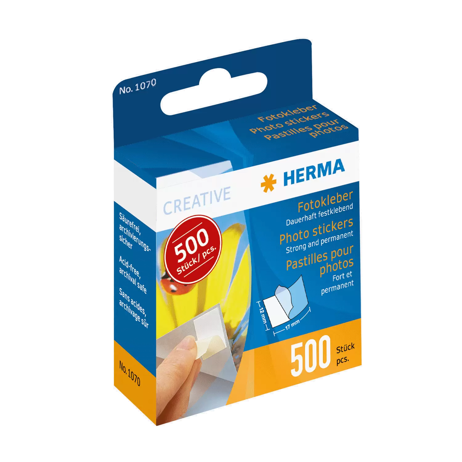 Snel, schoon en sterk hechtend! HERMA foto-lijmpads zijn aan weerszijden zelfklevende, permanent hechtende papieren pads, ideaal voor het permanent inplakken en opplakken van foto's, ansichtkaarten en nog veel meer. Eén zijde plakt meteen, de andere zijde is afgedekt met beschermpapier. Om het beschermpapier er snel en gemakkelijk af te kunnen trekken, hebben ze een praktisch treklipje. De lijmpads zijn 12 x 17 mm groot en kunnen dankzij het praktische dispenserdoosje apart worden uitgenomen en stuk voor stuk worden aangebracht. De lijm is oplosmiddel- en zuurvrij, tast foto's niet aan en is archiveringsbestendig. Ideaal voor het klassiek inplakken van foto's en prenten, maar ook voor knutselwerkjes, voor het maken van collages, voor scrapbooking en voor decoraties. Een verpakking bevat 500 lijmpads van papier.