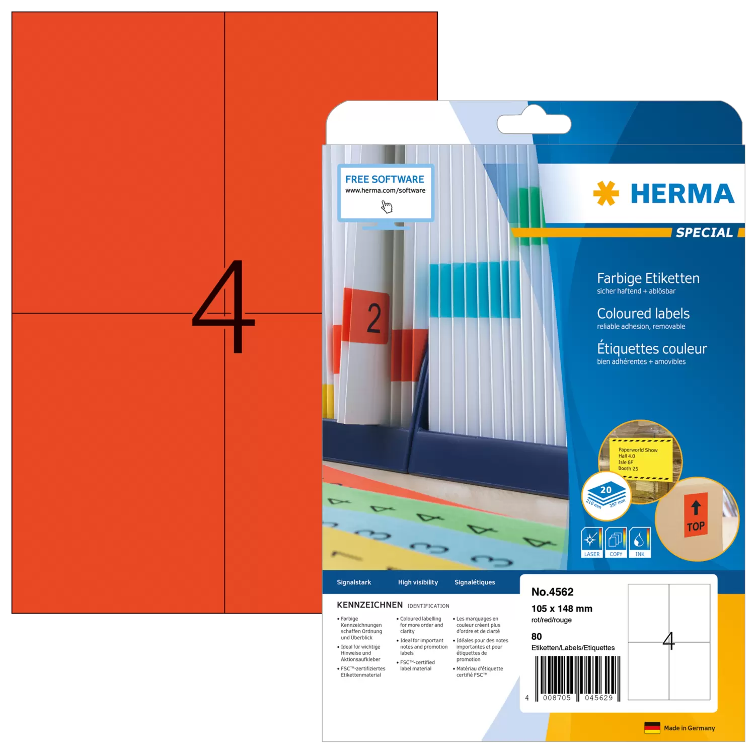 Gekleurde etiketten, A4, 105 x 148 mm, rood, verwijderbaar