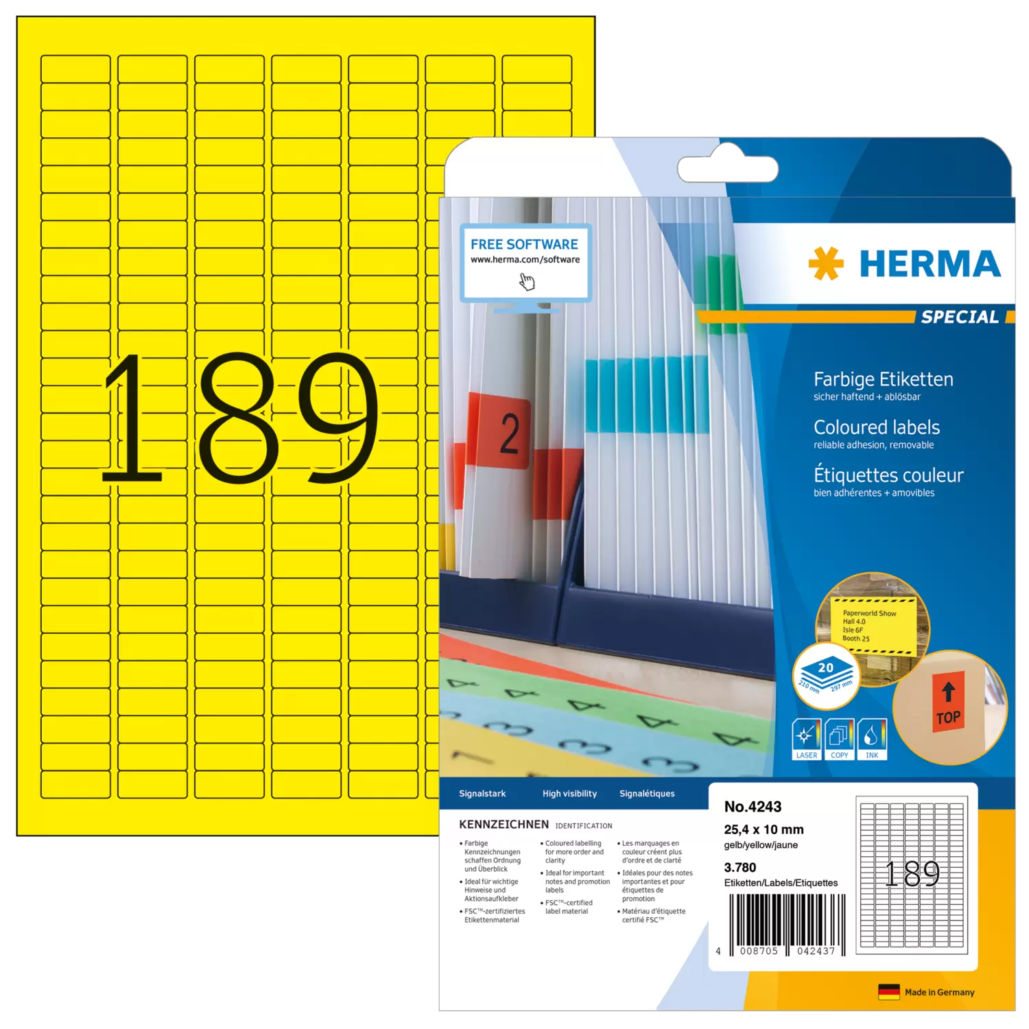 Gekleurde etiketten op A4-vellen, zelfklevend. Ideaal voor het labelen met signaalfunctie, bijv. waarschuwingsstickers, spoedaantekeningen, adreswijzigingen, kleurcodering, acties. Milieuvriendelijk: FSC® Mix Credit-gecertificeerd, chloorvrij gebleekt, oplosmiddelvrije contactlijm. Etiketten zijn 100 % recyclebaar via het oud papier, verpakking van gerecycled karton. Zeer goede drukresultaten op alle laser- en inkjetprinters, kopieerapparaten, kleurenlaserprinters en kleurenkopieerapparaten. Storingvrije verwerking dankzij veiligheidsrand rondom en optimale vlakligging. Gratis softwareoplossingen: www.herma.com/software.