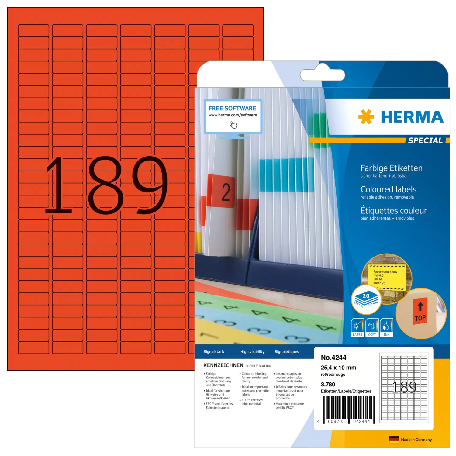 Gekleurde etiketten, A4, 25,4 x 10 mm, rood, verwijderbaar