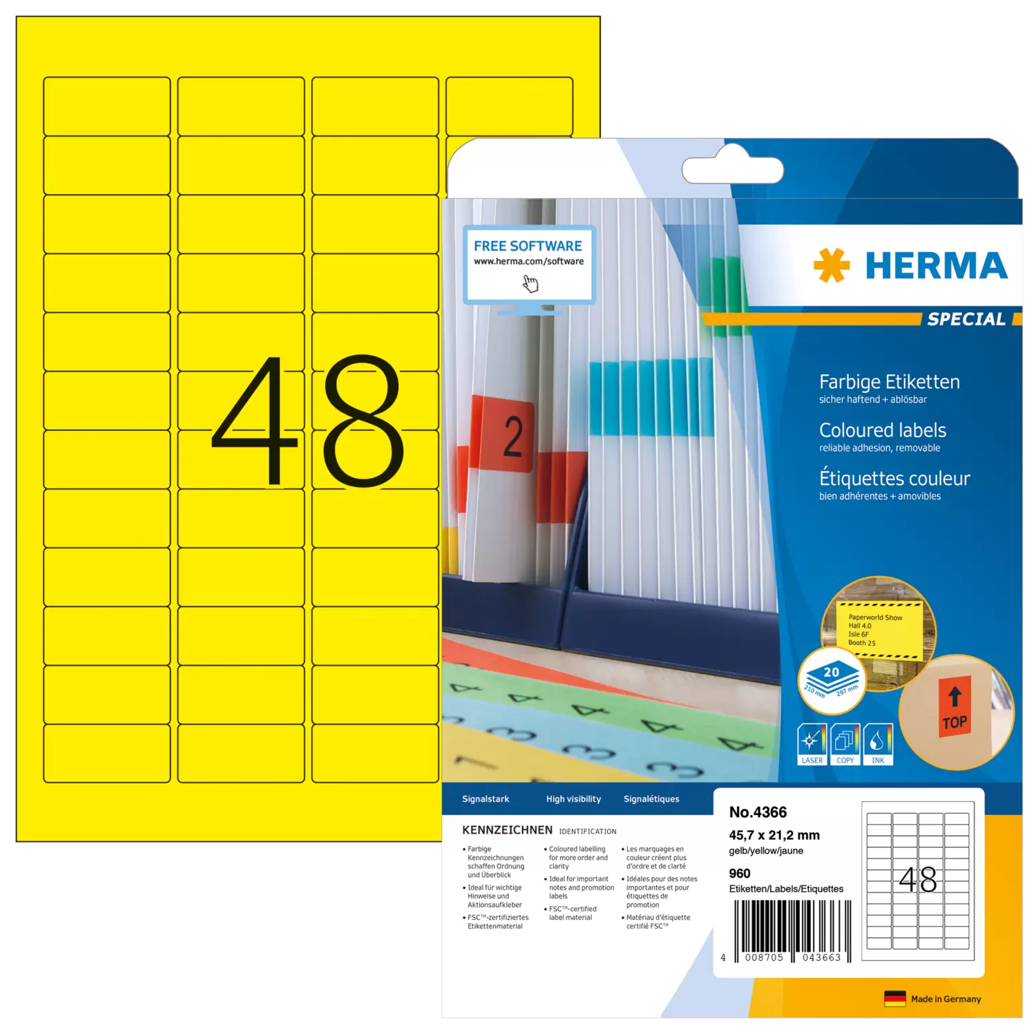 Gekleurde etiketten, A4, 45,7 x 21,2 mm, geel, verwijderbaar