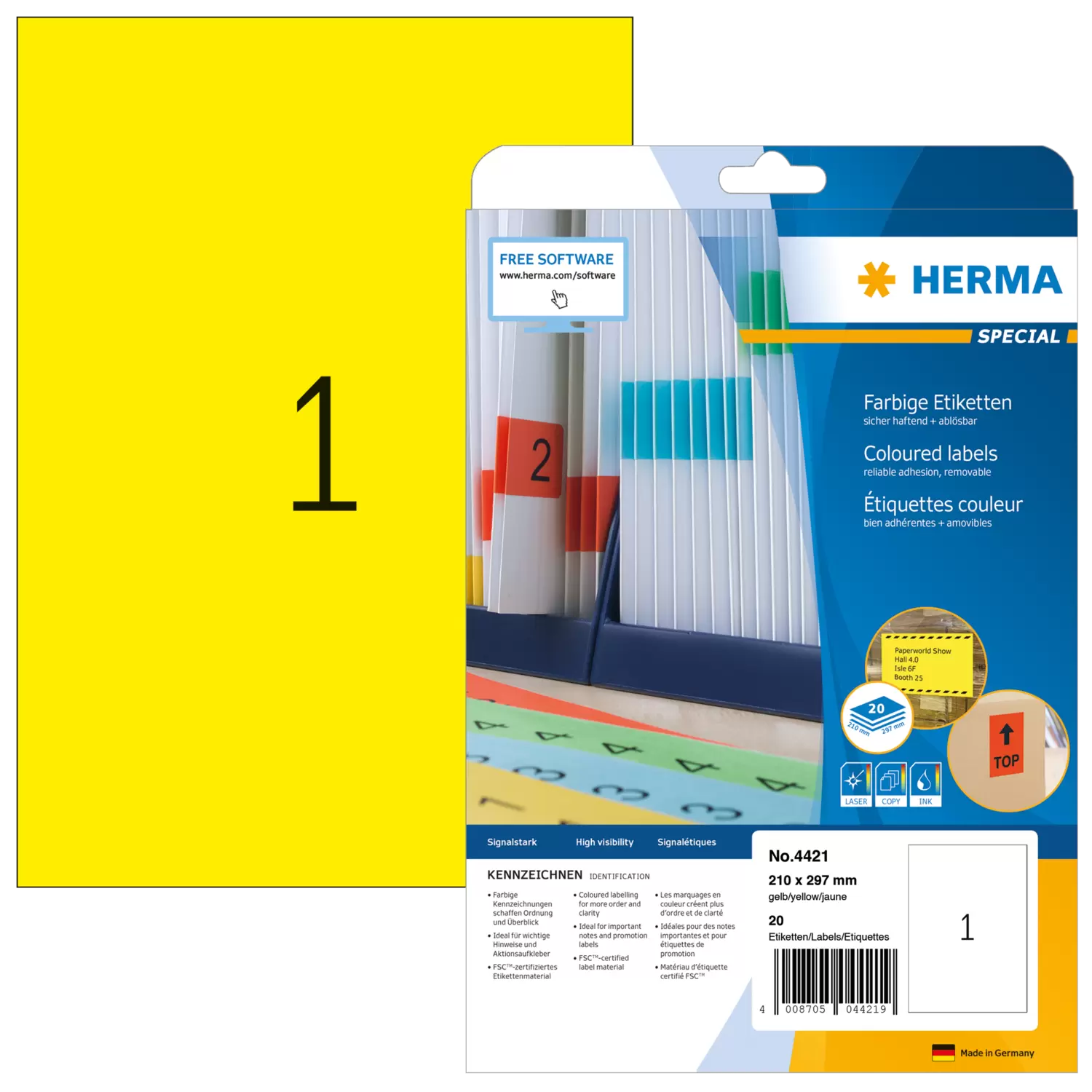 Gekleurde etiketten op A4-vellen, zelfklevend. Ideaal voor het labelen met signaalfunctie, bijv. waarschuwingsstickers, spoedaantekeningen, adreswijzigingen, kleurcodering, acties. Milieuvriendelijk: FSC® Mix Credit-gecertificeerd, chloorvrij gebleekt, oplosmiddelvrije contactlijm. Etiketten zijn 100 % recyclebaar via het oud papier, verpakking van gerecycled karton. Zeer goede drukresultaten op alle laser- en inkjetprinters, kopieerapparaten, kleurenlaserprinters en kleurenkopieerapparaten. Storingvrije verwerking dankzij veiligheidsrand rondom en optimale vlakligging. Gratis softwareoplossingen: www.herma.com/software.