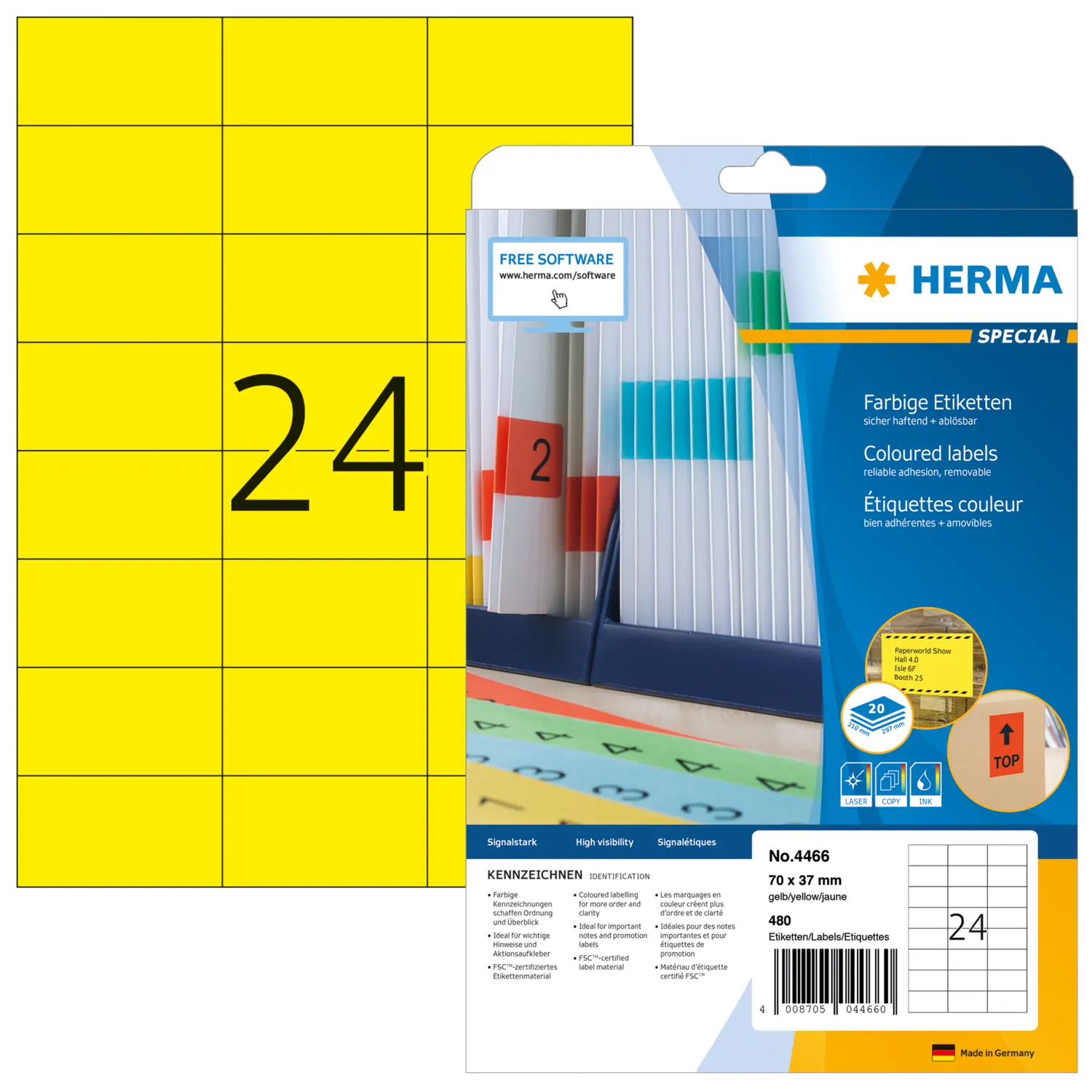 Gekleurde etiketten op A4-vellen, zelfklevend. Ideaal voor het labelen met signaalfunctie, bijv. waarschuwingsstickers, spoedaantekeningen, adreswijzigingen, kleurcodering, acties. Milieuvriendelijk: FSC® Mix Credit-gecertificeerd, chloorvrij gebleekt, oplosmiddelvrije contactlijm. Etiketten zijn 100 % recyclebaar via het oud papier, verpakking van gerecycled karton. Zeer goede drukresultaten op alle laser- en inkjetprinters, kopieerapparaten, kleurenlaserprinters en kleurenkopieerapparaten. Storingvrije verwerking dankzij veiligheidsrand rondom en optimale vlakligging. Gratis softwareoplossingen: www.herma.com/software.