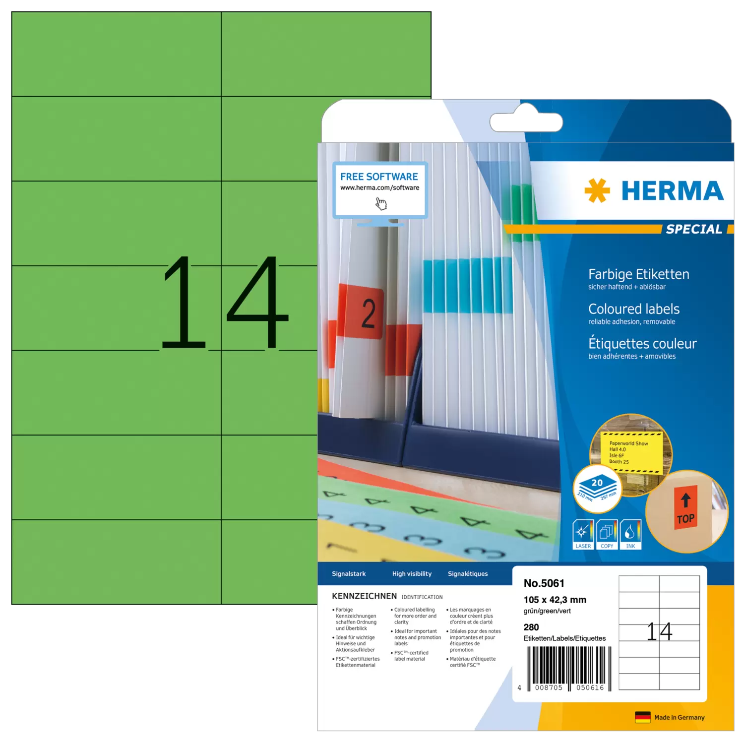Gekleurde etiketten op A4-vellen, zelfklevend. Ideaal voor het labelen met signaalfunctie, bijv. waarschuwingsstickers, spoedaantekeningen, adreswijzigingen, kleurcodering, acties. Milieuvriendelijk: FSC® Mix Credit-gecertificeerd, chloorvrij gebleekt, oplosmiddelvrije contactlijm. Etiketten zijn 100 % recyclebaar via het oud papier, verpakking van gerecycled karton. Zeer goede drukresultaten op alle laser- en inkjetprinters, kopieerapparaten, kleurenlaserprinters en kleurenkopieerapparaten. Storingvrije verwerking dankzij veiligheidsrand rondom en optimale vlakligging. Gratis softwareoplossingen: www.herma.com/software.