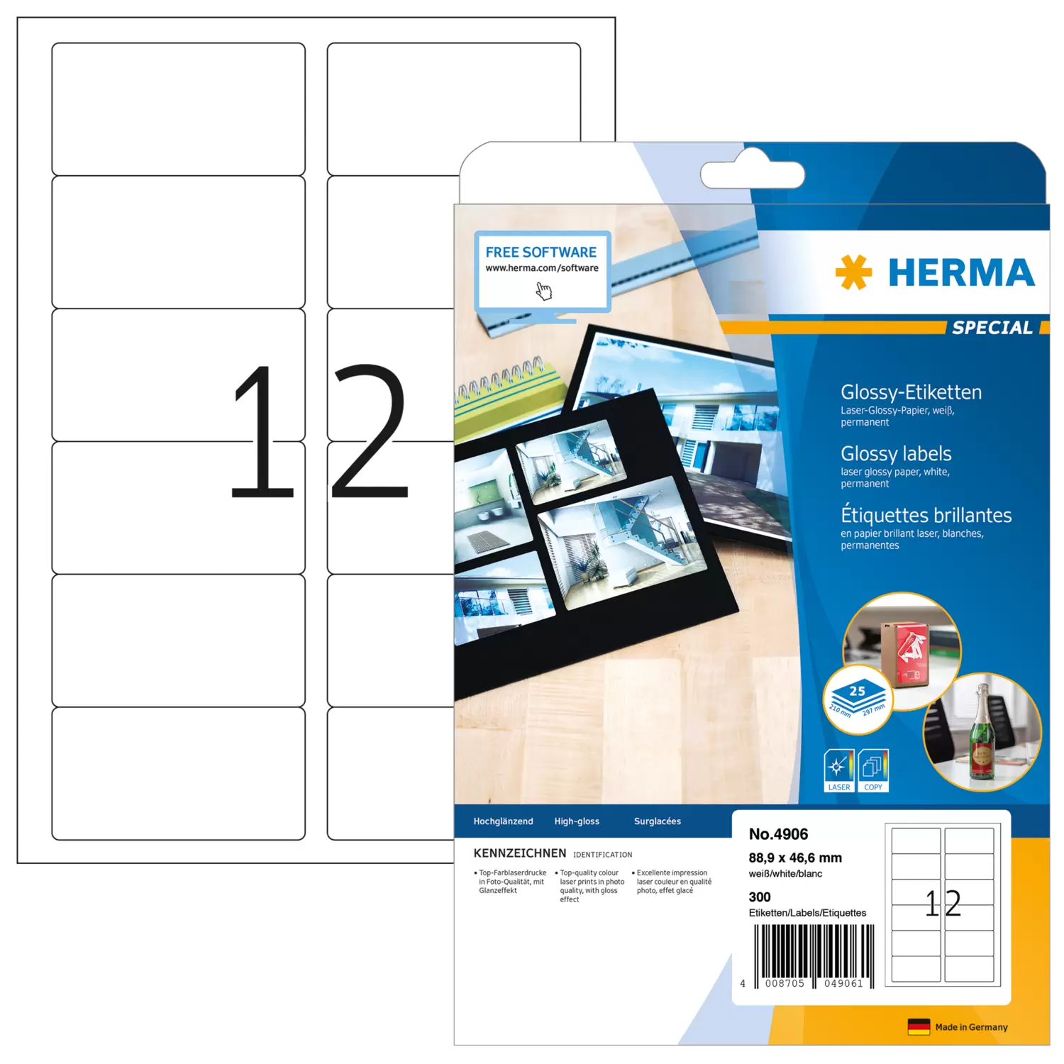 Hoogglans-etiketten, op A4-vellen, zelfklevend. Voor optisch hoogwaardige toepassingen, bijv. hoogwaardige productstickers, foto-afdrukken, presentaties. Glanzend glossy-papier met een hoge dekkracht, voor afdrukken met intense kleuren en zeer scherpe contouren. Top-kleurenlaserafdrukken van fotokwaliteit, gelijkmatige toneroverdracht. Voor laserprinters, kopieerapparaten, kleurenlaserprinters en kleurenkopieerapparaten. Niet geschikt voor inkjetprinters. Gratis softwareoplossingen: www.herma.com/software.