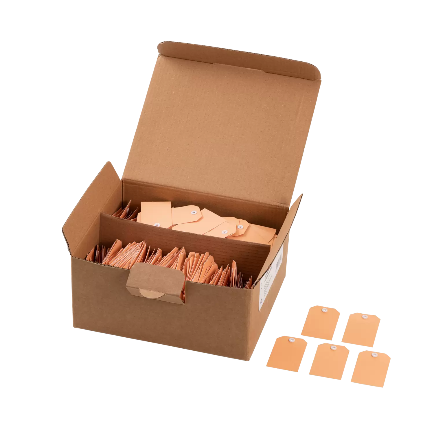 Dozenlabel, van glad bruin karton. Met afgeschuinde hoeken.
