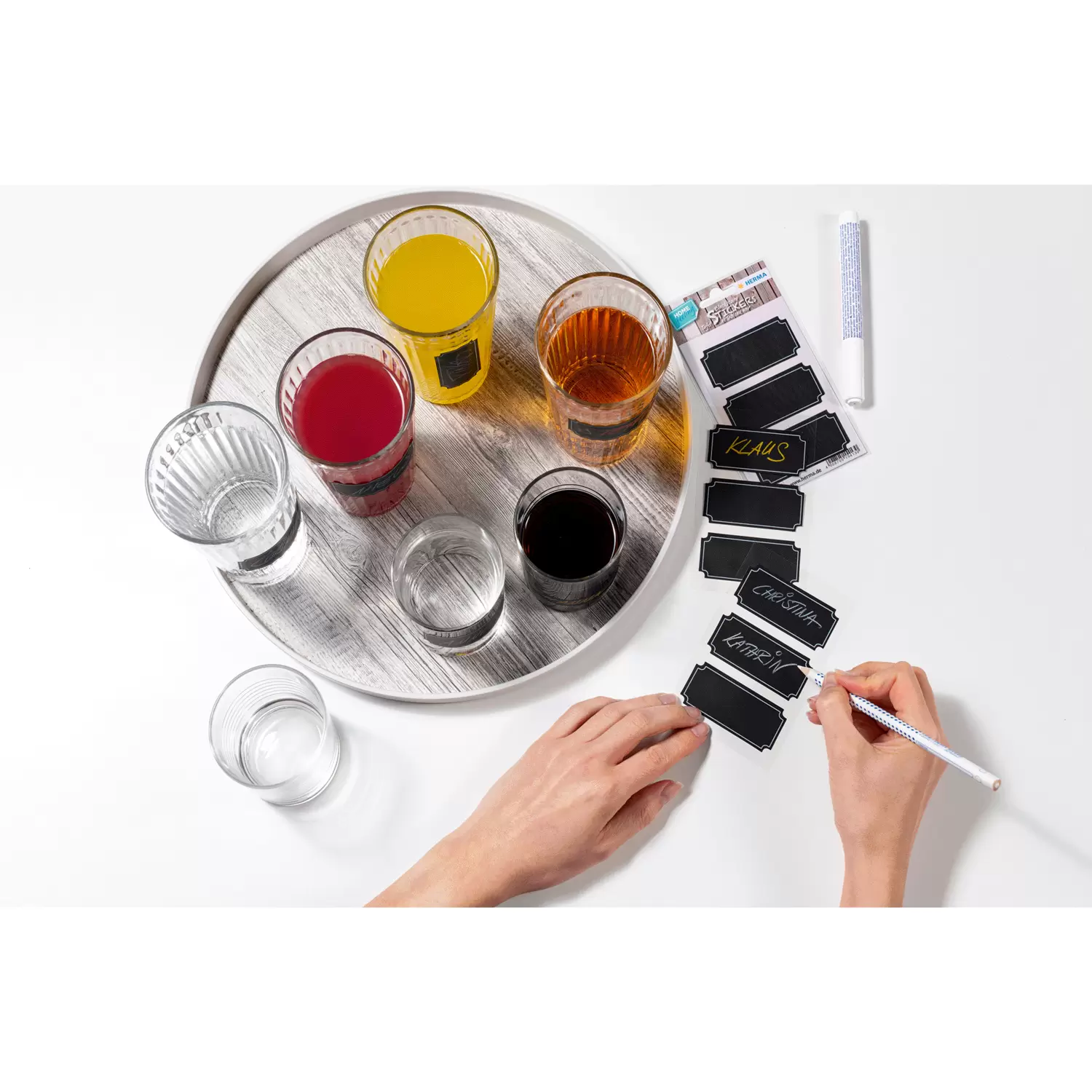 Krijtbordetiketten: Perfect om te decoreren of kado te geven. Met krijtjes of krijtstift te beschrijven. Met vocht uitwisbaar en opnieuw te beschrijven. De etiketten plakken permanent op alle gladde opp ervlakken zoals glas, keramiek, kunststof en metaal