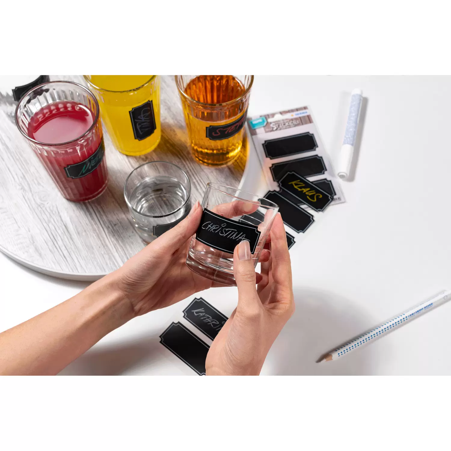 Krijtbordetiketten: Perfect om te decoreren of kado te geven. Met krijtjes of krijtstift te beschrijven. Met vocht uitwisbaar en opnieuw te beschrijven. De etiketten plakken permanent op alle gladde opp ervlakken zoals glas, keramiek, kunststof en metaal