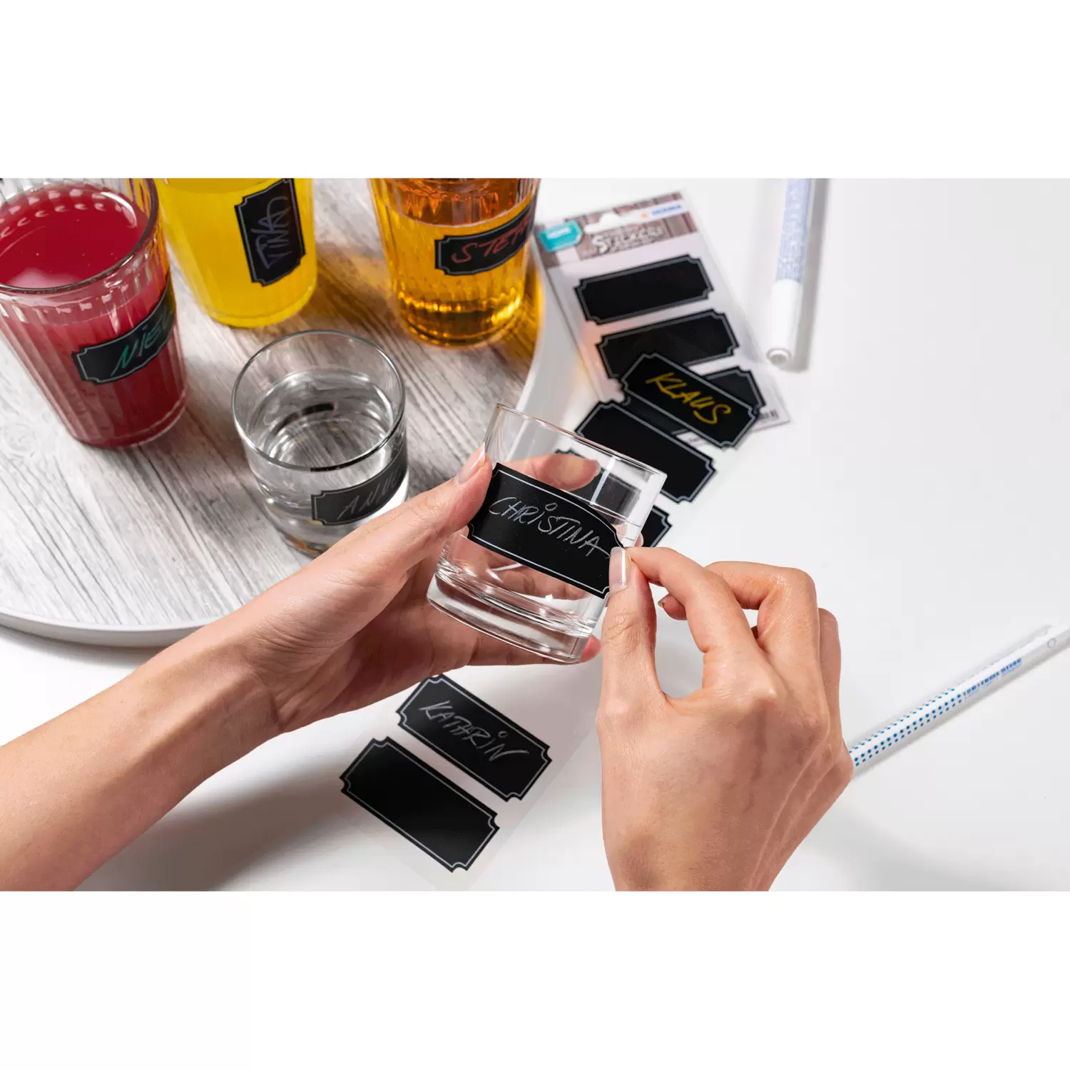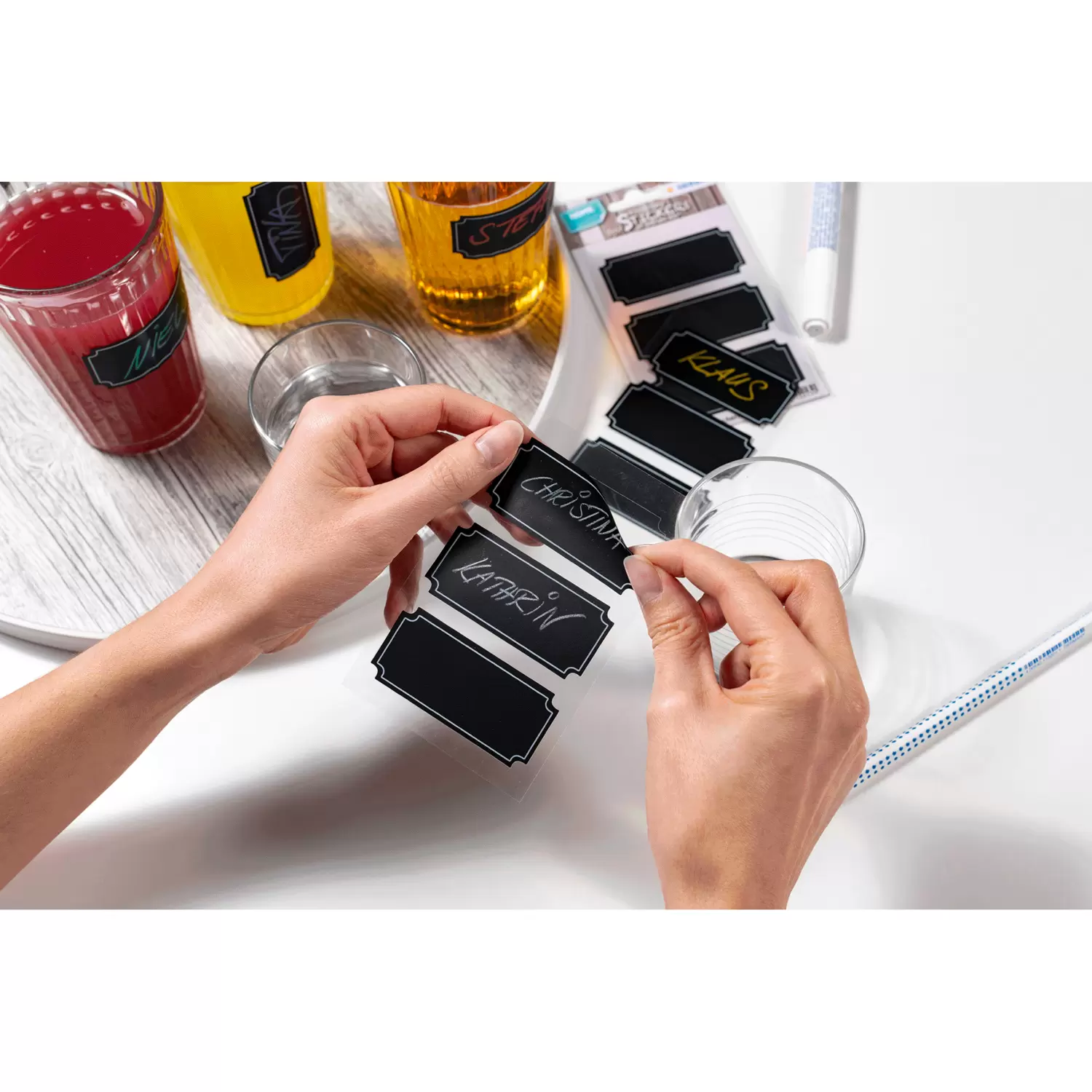 De krijtbordetiketten laten in de vaatwasmachine door het afwasmiddel los en zijn daarom niet vaatwasmachinebestendig.