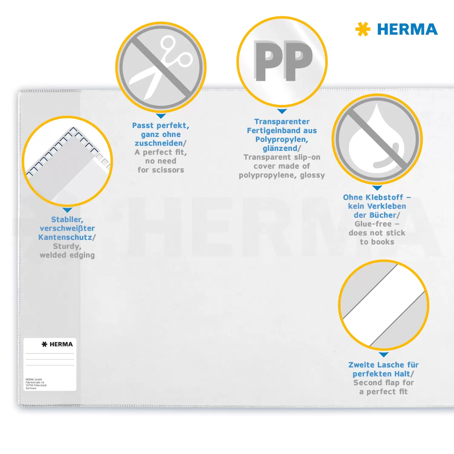 De HERMA boekenkaften zijn voorzien van een gepatenteerde gesealde rand en worden zonder lijm geproduceerd, zodat de boeken en de kaften niet aan elkaar blijven plakken. Bovendien is de folie gemaakt van polypropyleen en bevat geen weekmakers. Dankzij deze eigenschap gaan de boekenkaften bijzonder lang mee en kunnen zo gemakkelijk meer dan één schooljaar worden gebruikt.