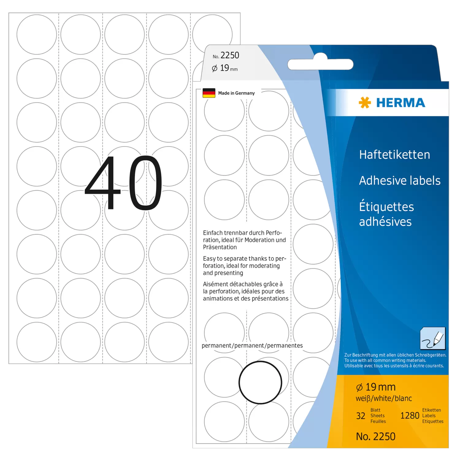 Multipurpose-etiketten, Ø 19 mm, rond wit, geperforeerd, permanent hechtend, om met de hand te besch