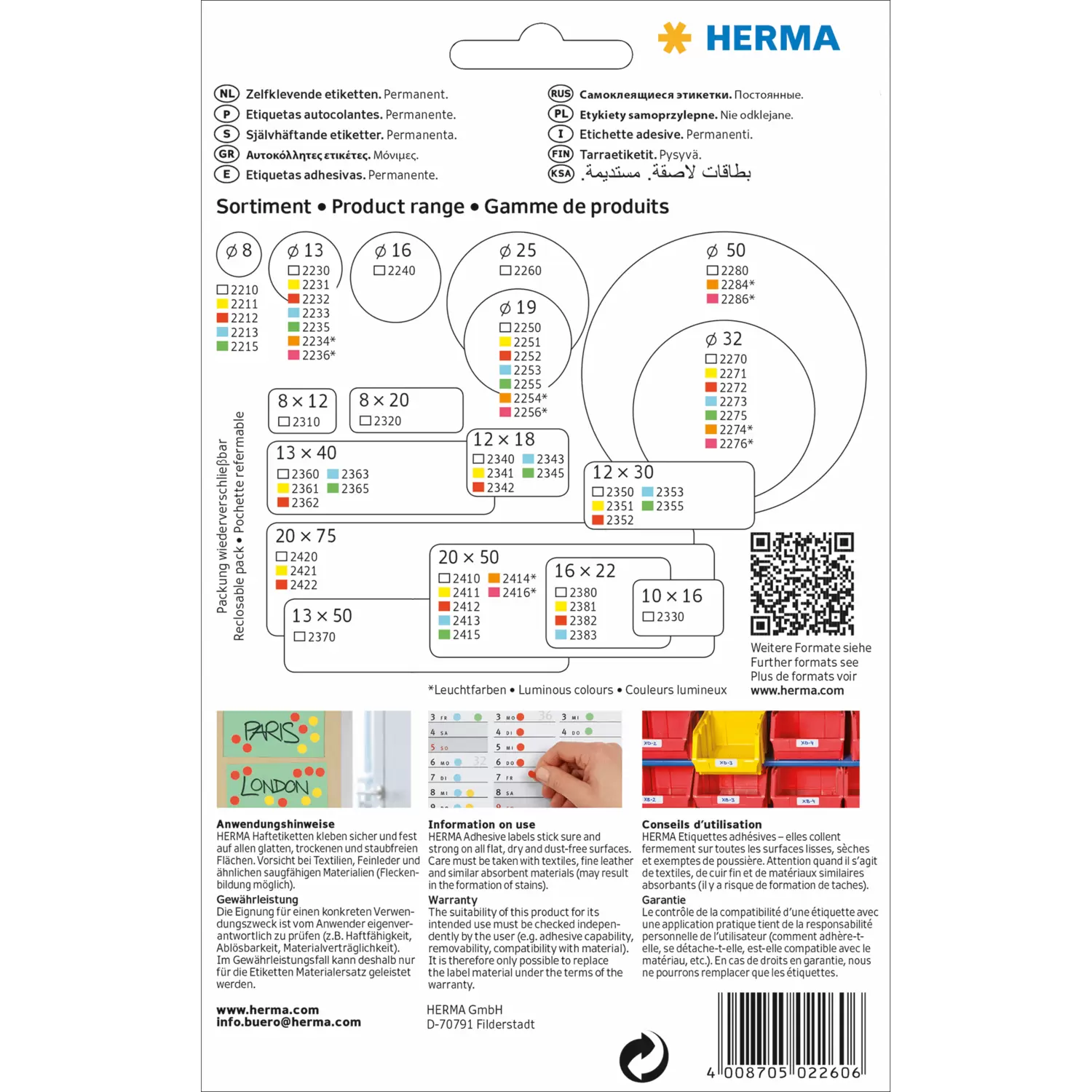 Universele etiketten voor markeren en organiseren. Zelfklevende etiketten van hoogwaardig schrijfpapier. Milieuvriendelijk: FSC® Mix Credit-gecertificeerd, chloorvrij gebleekt, oplosmiddelvrije contactlijm. Betrouwbaare hechting op alle oppervlakken. Vel formaat 111 x 170 mm. Voor handbeschrijving med alle schrijfmiddelen en schrijfmachines. Niet geschikt voor PC printers.