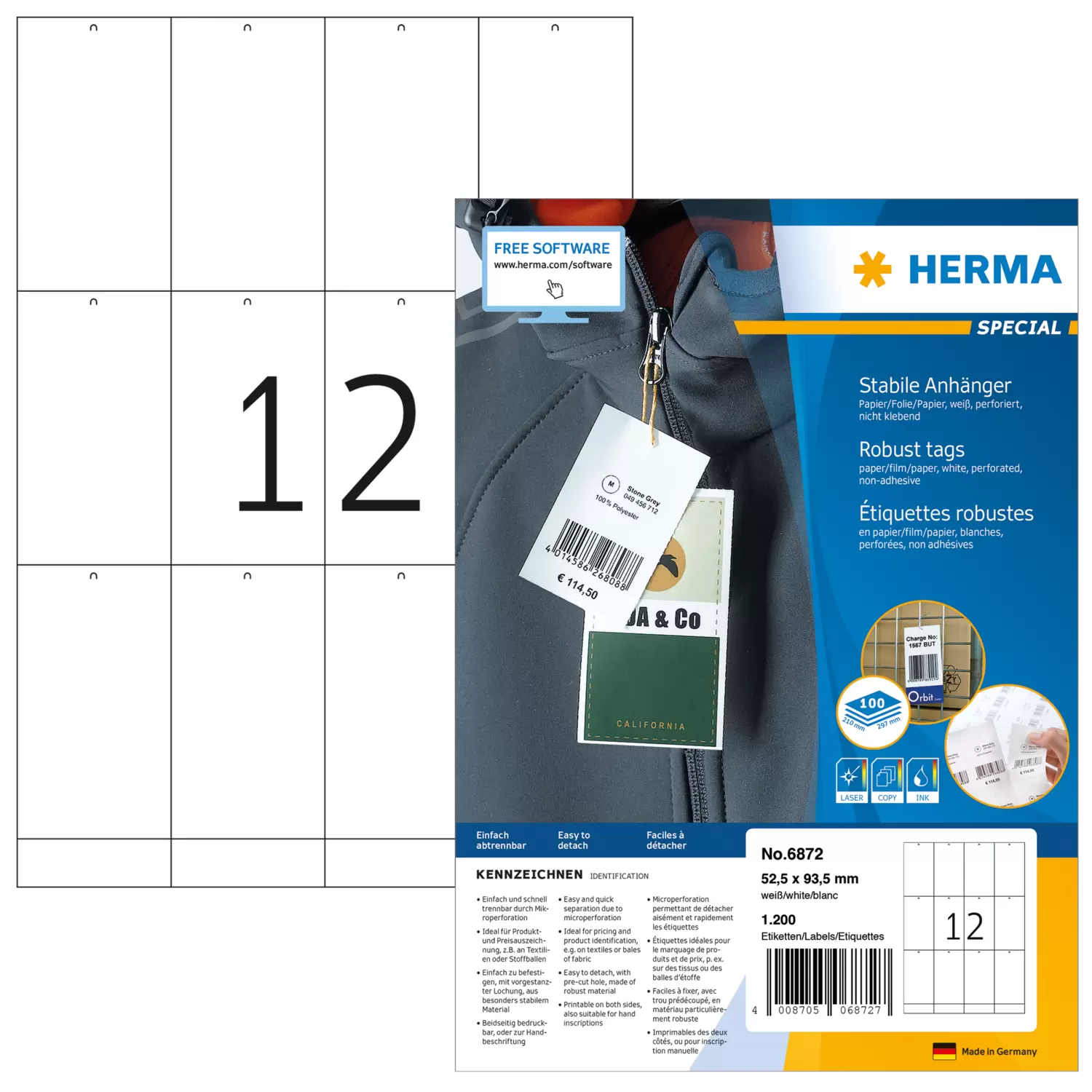 - Eenvoudig en snel af te scheuren dankzij de microperforatie, met voorgestanste gaatjes, eenvoudige bevestiging met touwtj es ofsplitpennetjes