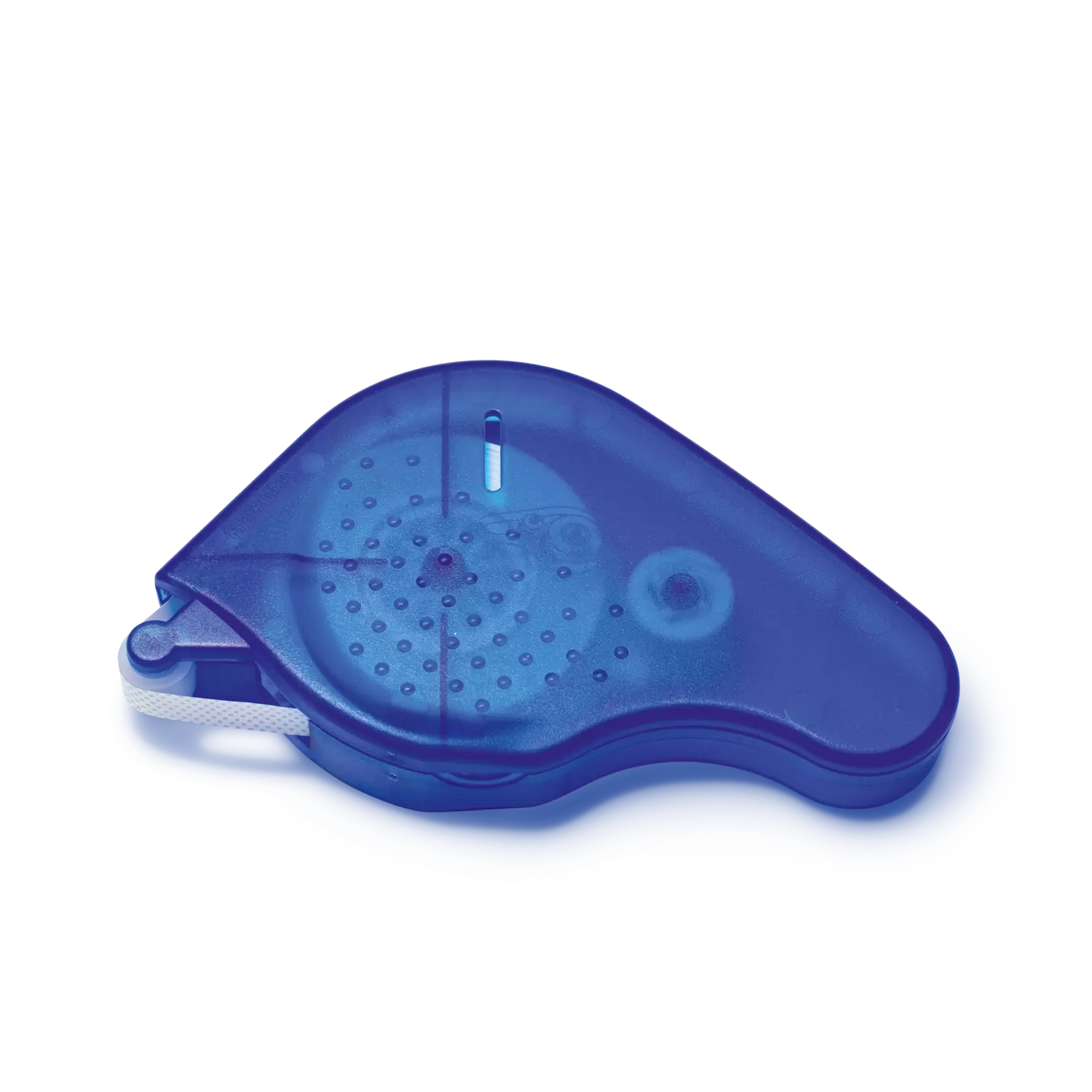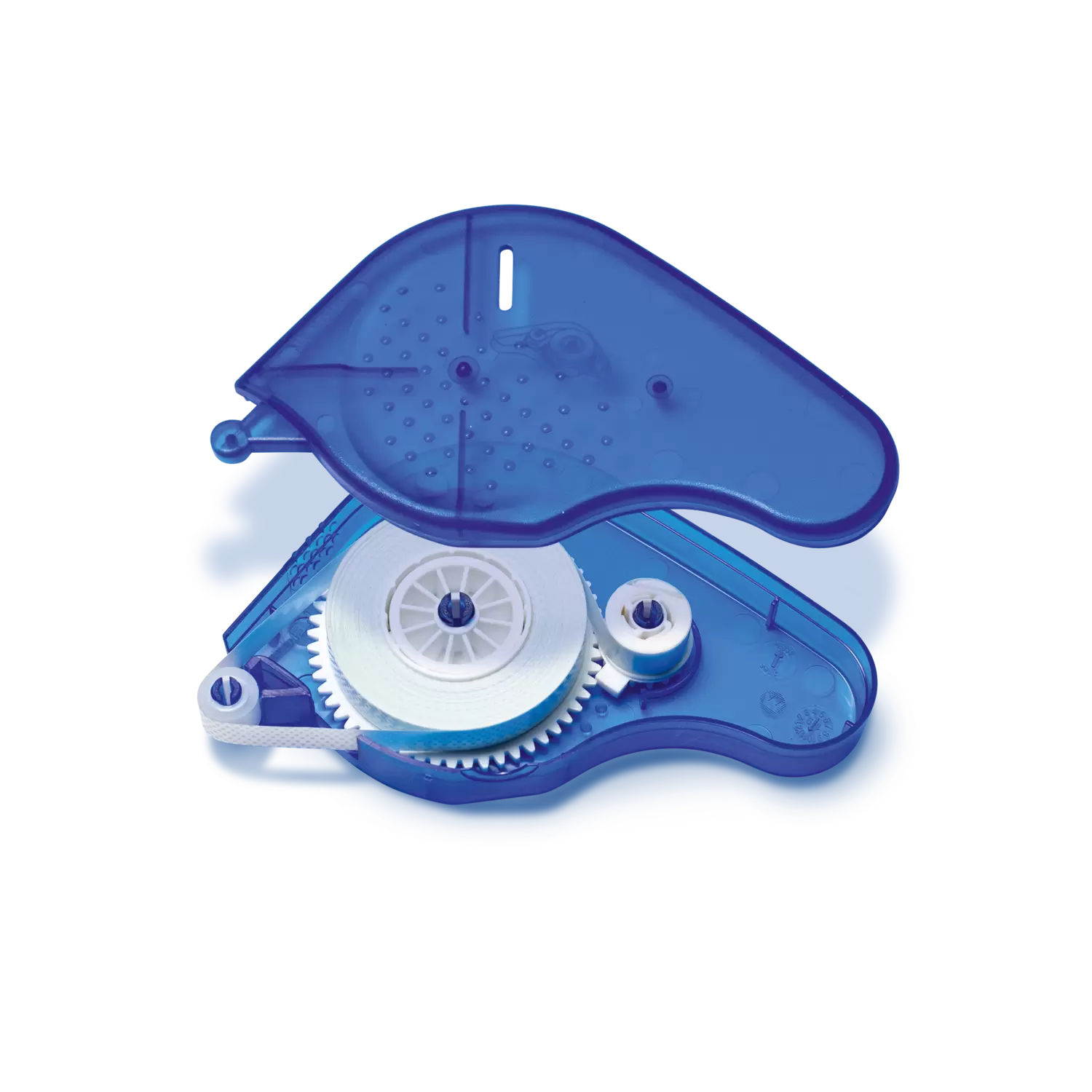 1. Open de lijmdispenser. 2. Verwijder het oude rolletje en plaats het nieuwe rolletje. 3. Maak het begin van het rolletje los en leg dit van beneden naar boven over de dispenser naar achteren tot aan de sluitpen. 4. Wikkel het uiteinde goed om de sluitpen.