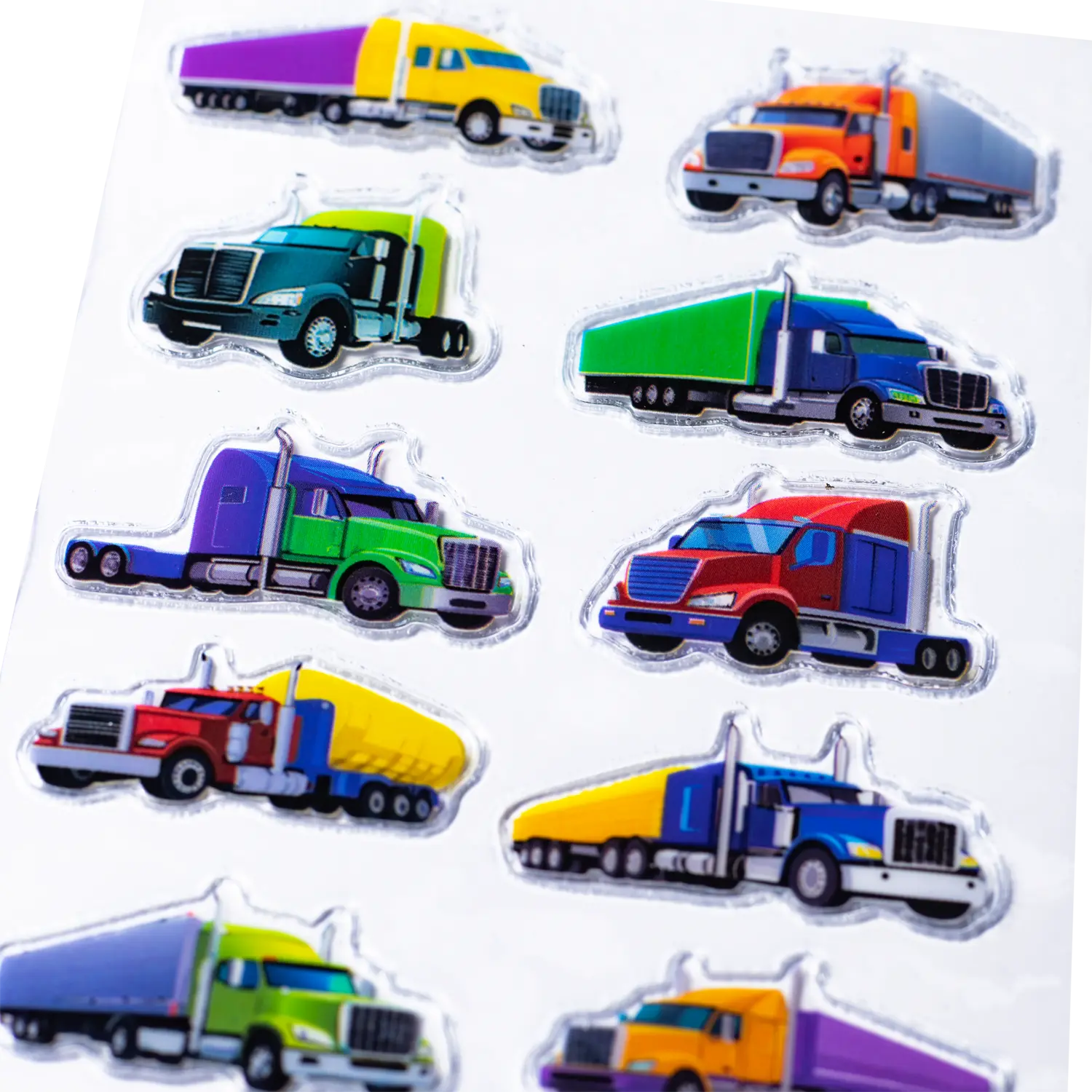 Deze coole vrachtwagenstickers combineren stoere ontwerpen met heldere kleuren en brengen grote voertuigen in miniformaat tot leven. Elk motief toont gedetailleerd ontworpen vrachtwagens in verschillende stijlen, die dynamiek en kracht uitstralen. Dankzij het hoogwaardige transpuffy materiaal krijgen de stickers een opvallend 3D effect, waardoor de voertuigen bijzonder indrukwekkend overkomen. De kleurrijke vrachtwagens vormen spannende accenten op schriften, knutselwerkjes of plakboeken en geven elk creatief project een extra dosis energie. Of ze nu worden verzameld, geruild, cadeau gegeven of decoratief worden gebruikt de coole vrachtwagens trekken overal de aandacht en nodigen uit om verhalen over snelheid, avontuur en vrijheid op de weg te laten ontstaan. Een kleurrijke set die veel rijplezier in elke verzameling brengt.