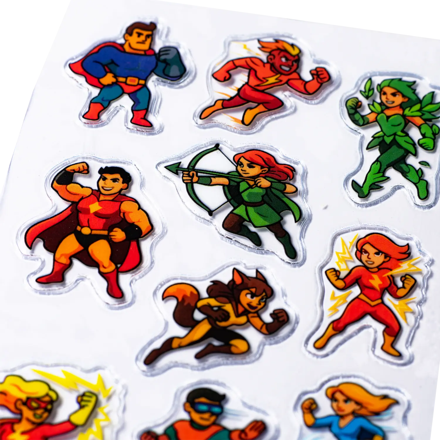 De superheldenstickers veranderen elk oppervlak in een podium vol avontuur. Krachtige figuren, dynamische actie en heldere kleuren creëren een wereld die wordt gekenmerkt door moed, kracht en fantasie. Dankzij het hoogwaardige transpuffy materiaal krijgen de motieven een opvallend 3D effect, dat hun effect nog versterkt en ze bijna tot leven brengt. Op schriften, ordners of creatieve knutselprojecten zorgen ze voor sterke accenten en geven ze elk object een vleugje energie van een stripverhaal. Of je ze nu verzamelt, ruilt of cadeau doet de ‘superhelden’ stickers zorgen voor veel afwisseling en bieden talloze mogelijkheden om je eigen verhalen te bedenken. Een gedetailleerde set die creativiteit stimuleert en het dagelijks leven verrijkt met een extra portie superkracht.