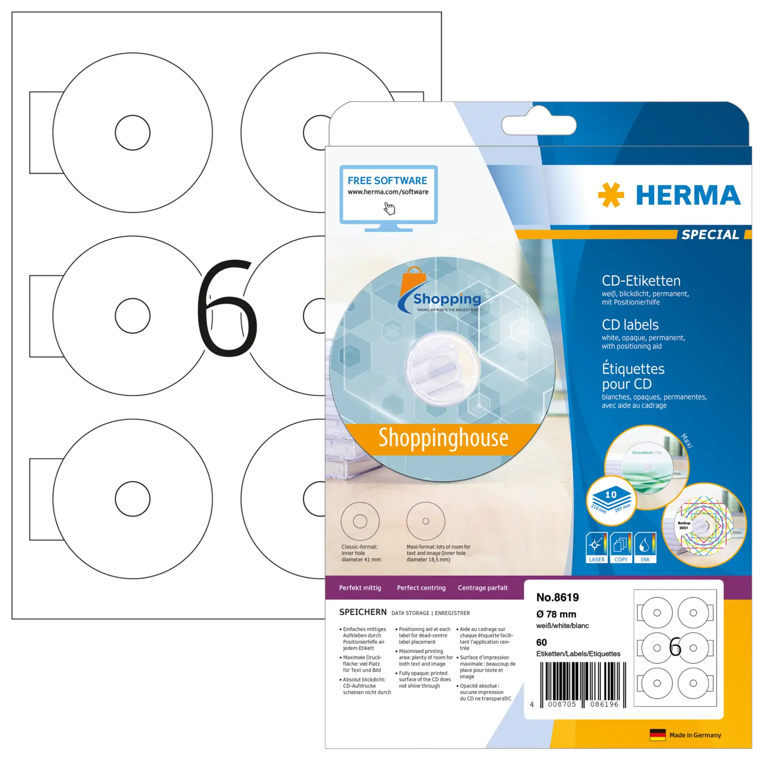 CD-etiketten Mini A4, Ø 78 mm, wit, ondoorzichtig, permanent hechtend