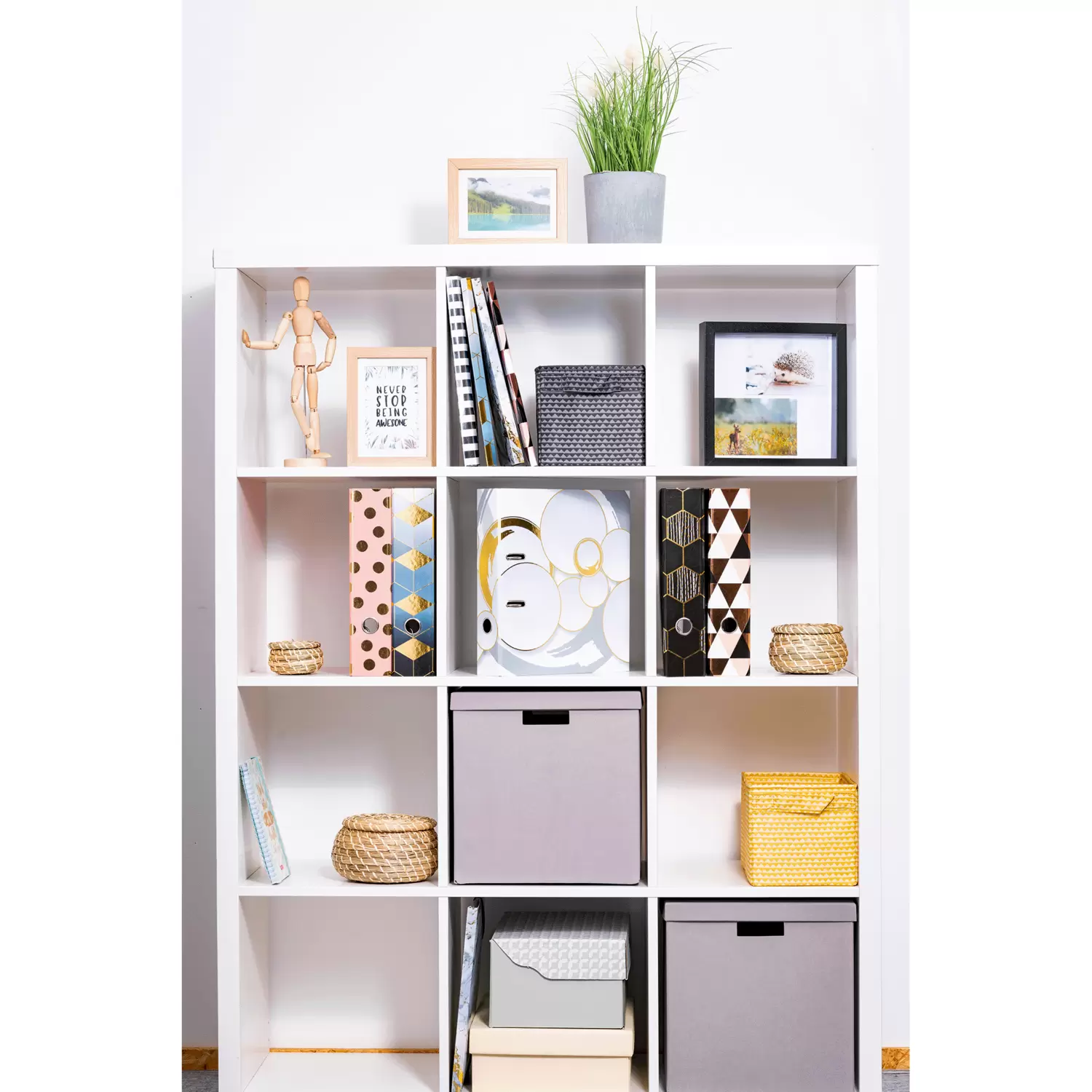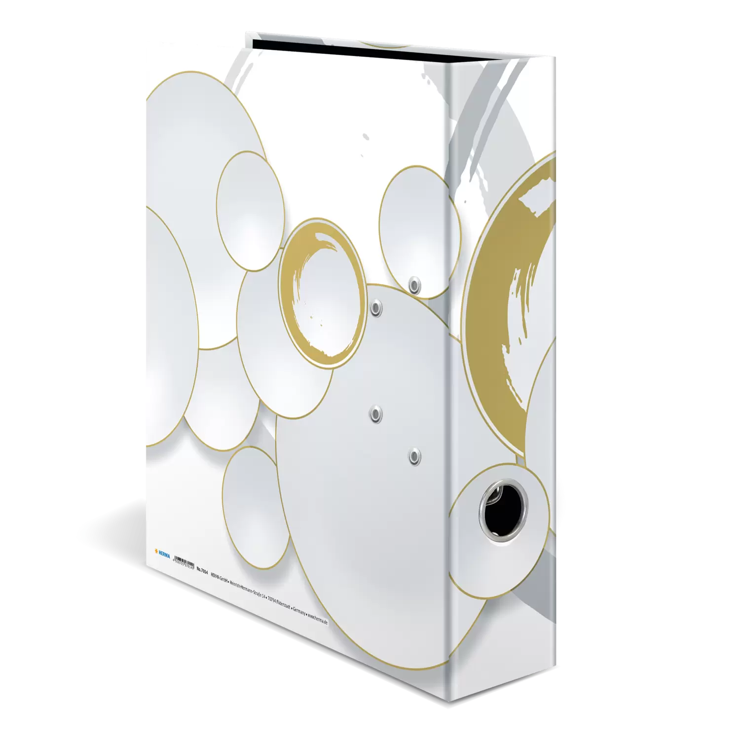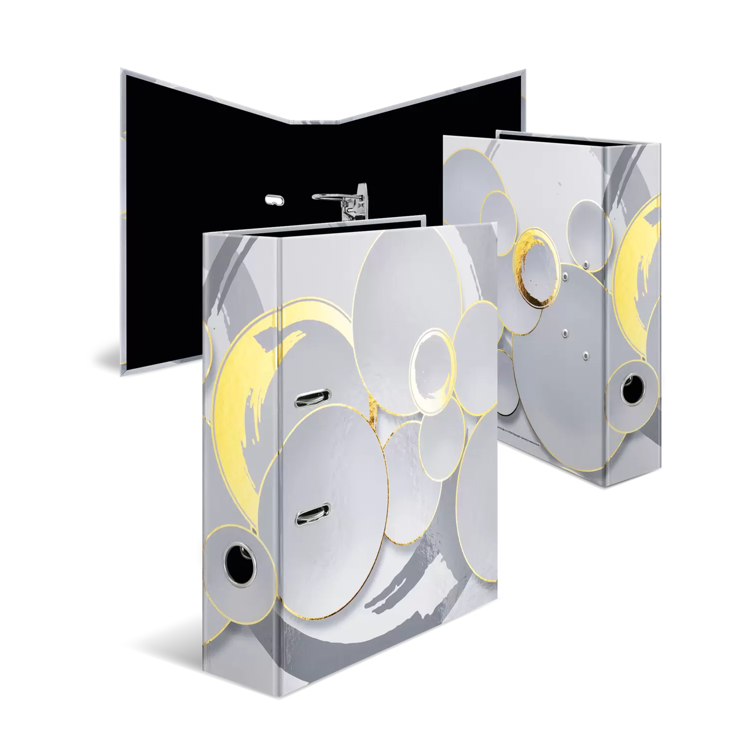De thema-ordner Circles is heel bijzonder, omdat hij design en functionaliteit op zeer hoog niveau combineert. Het ontwerp is in zachte wit- en grijstinten gehouden, fijne cirkels verweven in glanzend goud, omgeven door organisch-ronde vormen. Een highlight en blikvanger! De ordner is gemaakt van hoogwaardig karton, veredeld met goudfolie en dankzij het praktische vingergat heel gemakkelijk uit de kast te pakken en terug te zetten. Het speciale hefboommechanisme met metalen klem zorgt ervoor dat de inhoud van de ordner netjes en stevig bij elkaar wordt gehouden. De brede rug garandeert dat de ordner stevig staat in de kast en voldoende plek biedt voor talloze documenten in formaten tot DIN A4.