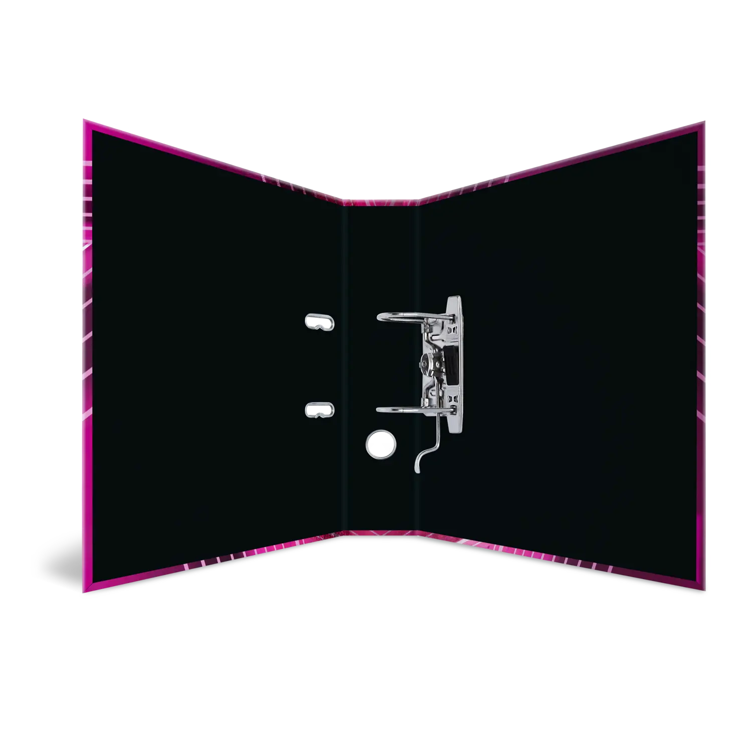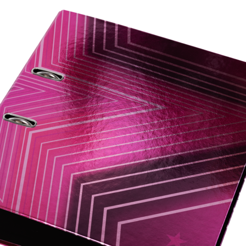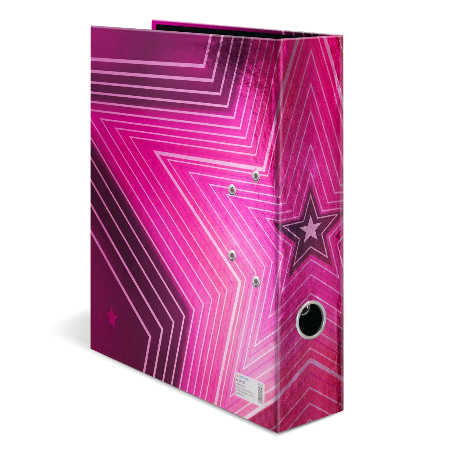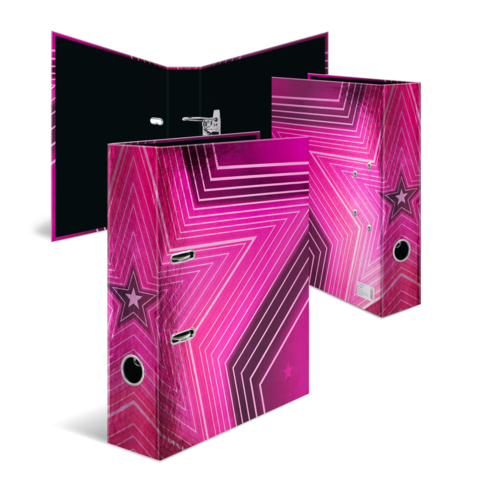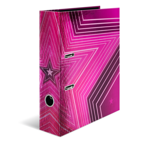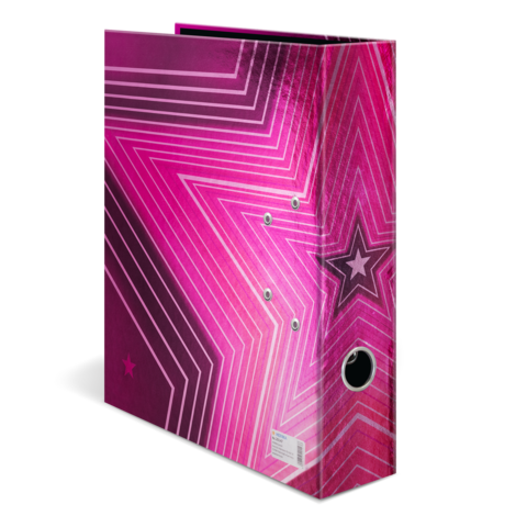 De motief ordner "Venus" is heel bijzonder, omdat deze design en functionaliteit op het hoogste niveau combineert. Het opvallende, stralende roze ontwerp, bezaaid met bijna lichtgevende sterren, is een absoluut hoogtepunt en zeker een blikvanger! De map is gemaakt van hoogwaardig karton, afgewerkt met een speciaal drukproces op spiegelende folie en dankzij het praktische grijpgat gemakkelijk te pakken en weer terug te plaatsen. Het speciale hefboommechaniek met metalen klem zorgt ervoor dat de inhoud van de map netjes en stabiel bij elkaar blijft. De brede rug garandeert stabiliteit in de kast en voldoende ruimte voor veel documenten tot DIN A4 formaat.