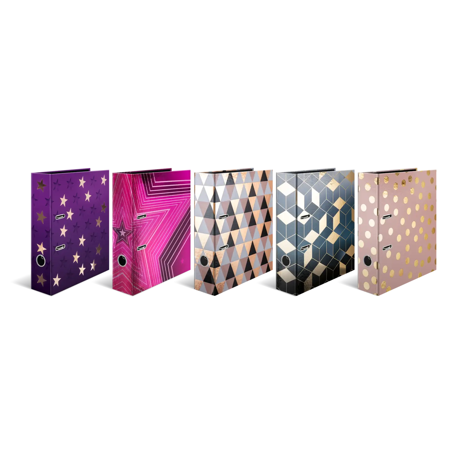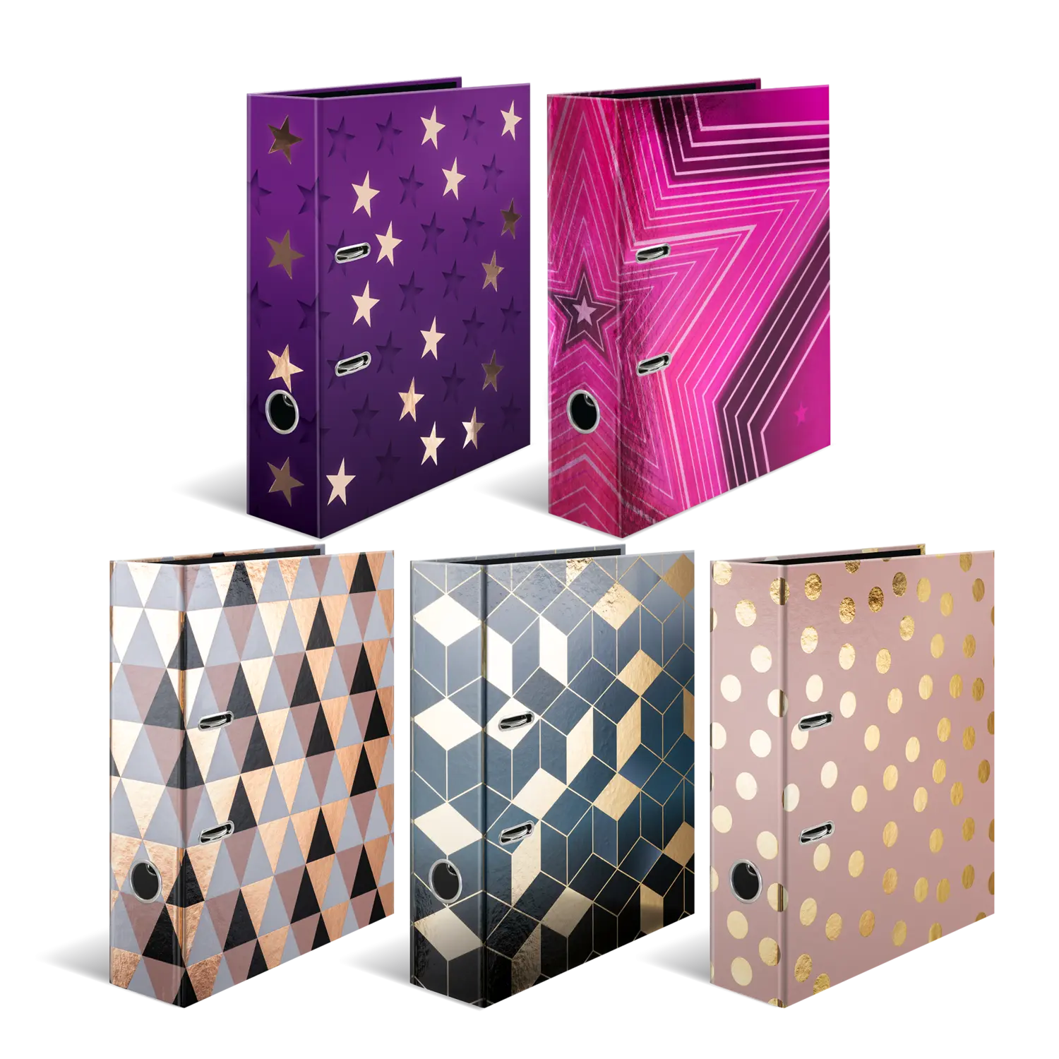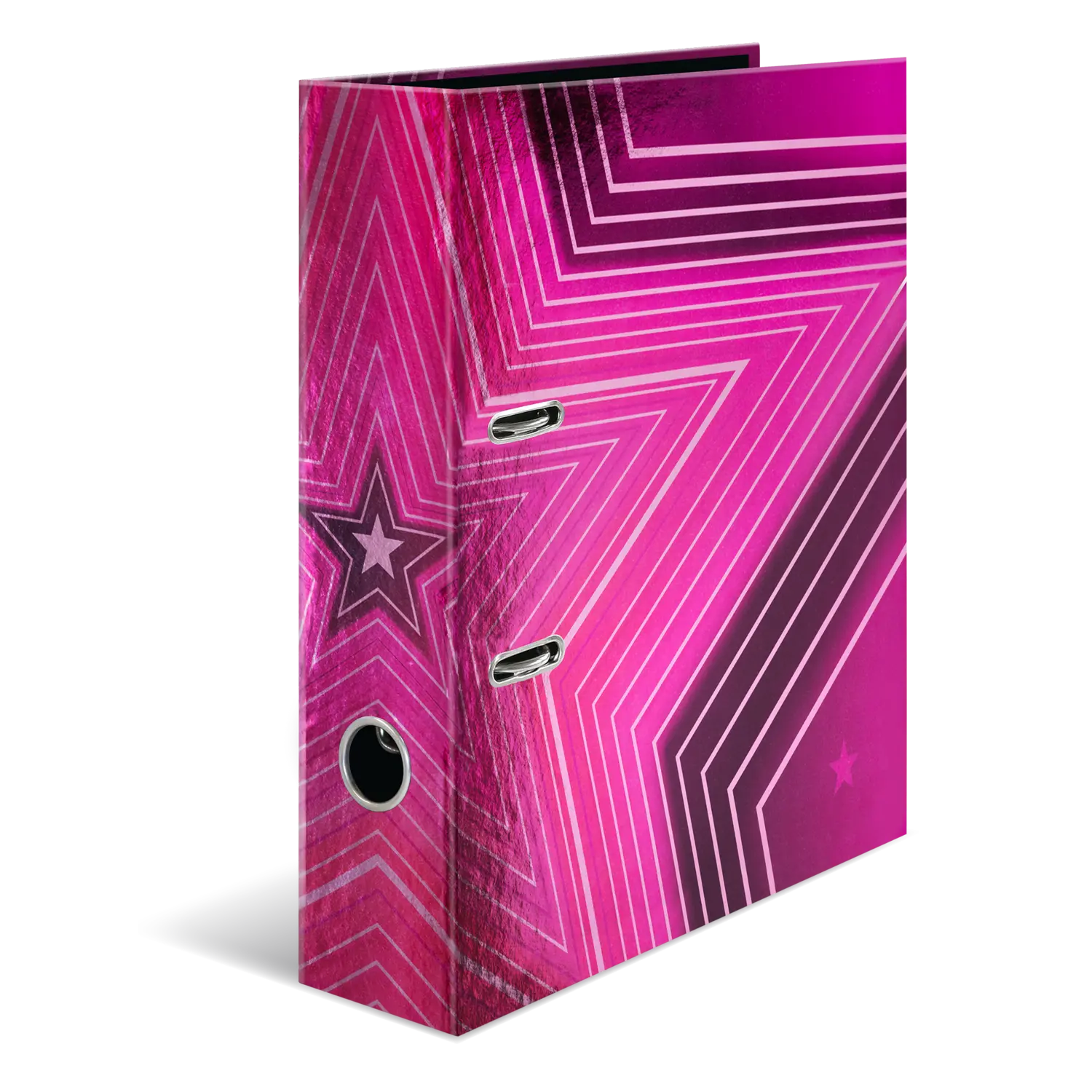 De motief ordner "Venus" is heel bijzonder, omdat deze design en functionaliteit op het hoogste niveau combineert. Het opvallende, stralende roze ontwerp, bezaaid met bijna lichtgevende sterren, is een absoluut hoogtepunt en zeker een blikvanger! De map is gemaakt van hoogwaardig karton, afgewerkt met een speciaal drukproces op spiegelende folie en dankzij het praktische grijpgat gemakkelijk te pakken en weer terug te plaatsen. Het speciale hefboommechaniek met metalen klem zorgt ervoor dat de inhoud van de map netjes en stabiel bij elkaar blijft. De brede rug garandeert stabiliteit in de kast en voldoende ruimte voor veel documenten tot DIN A4 formaat.